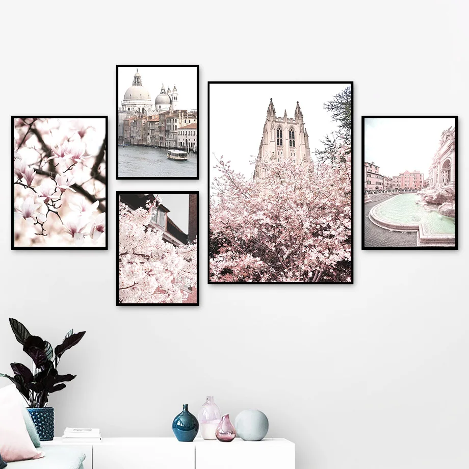 Настенные постеры с розовыми цветами, цветами вишни, розой, пионами...
