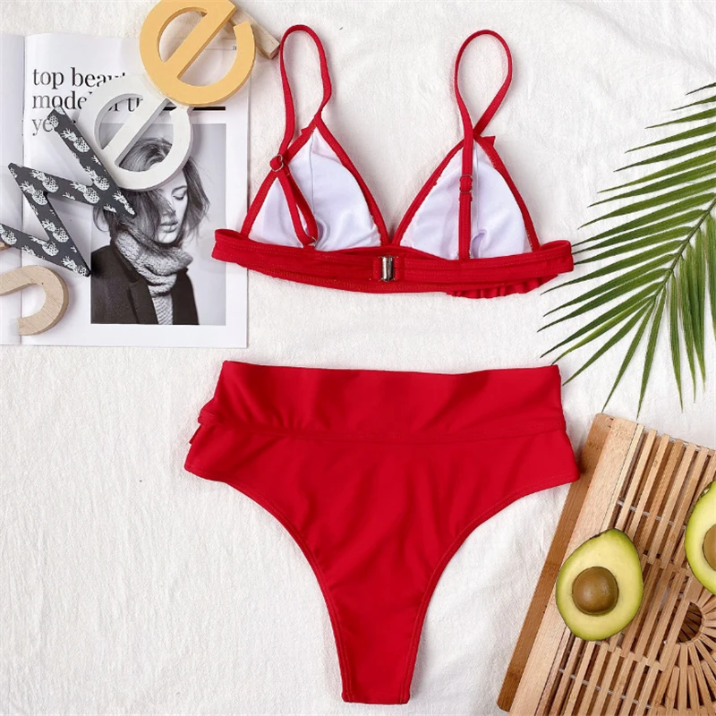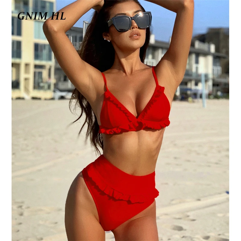 GNIM Высокая талия купальник, Одноцветный купальник, из Для женщин, комплект из 2 предметов, с оборками, бикини, для женщин, 2021 пикантные Треугольники шею, купальник, пуш-ап, Новое поступление купальный костюм