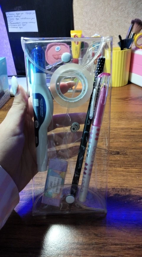Замечательная косметичка! к сожалению, шла очень долго, пришла в последний день ожидаемого срока. Качеством довольны, претензий не имею. Казалась больше, но с красивым канцелярскими принадлежностями смотрится эстетично.