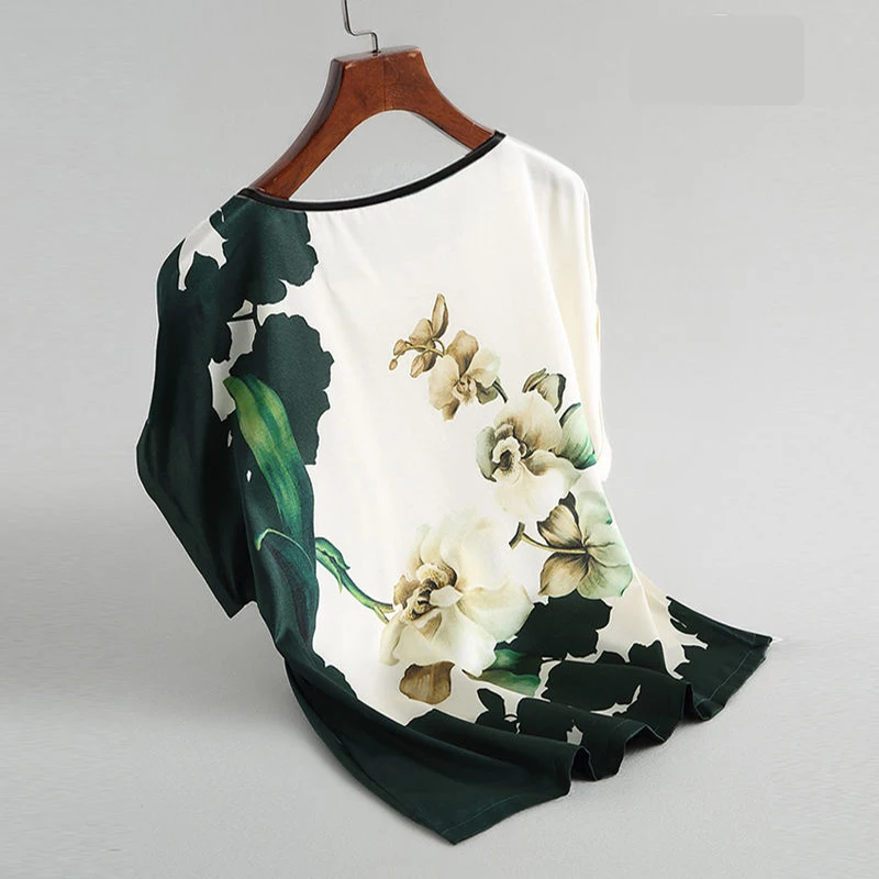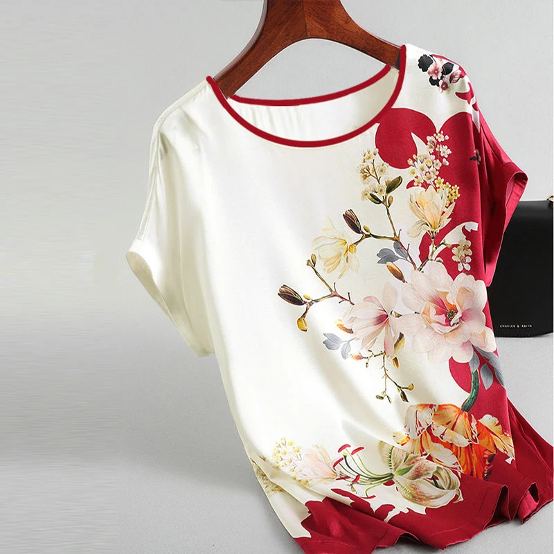 Блузка Женская атласная с коротким рукавом летучая мышь и цветочным...