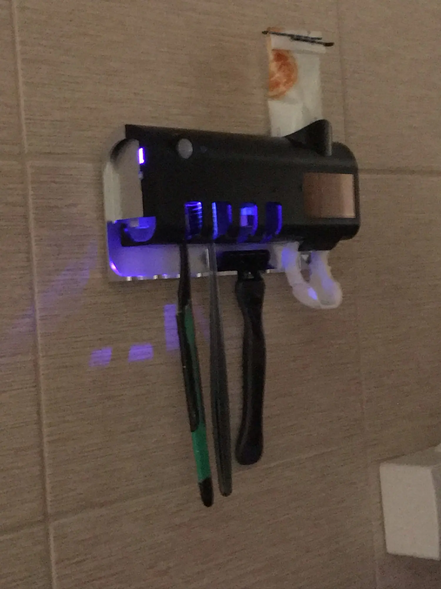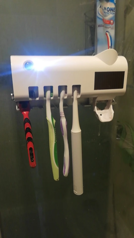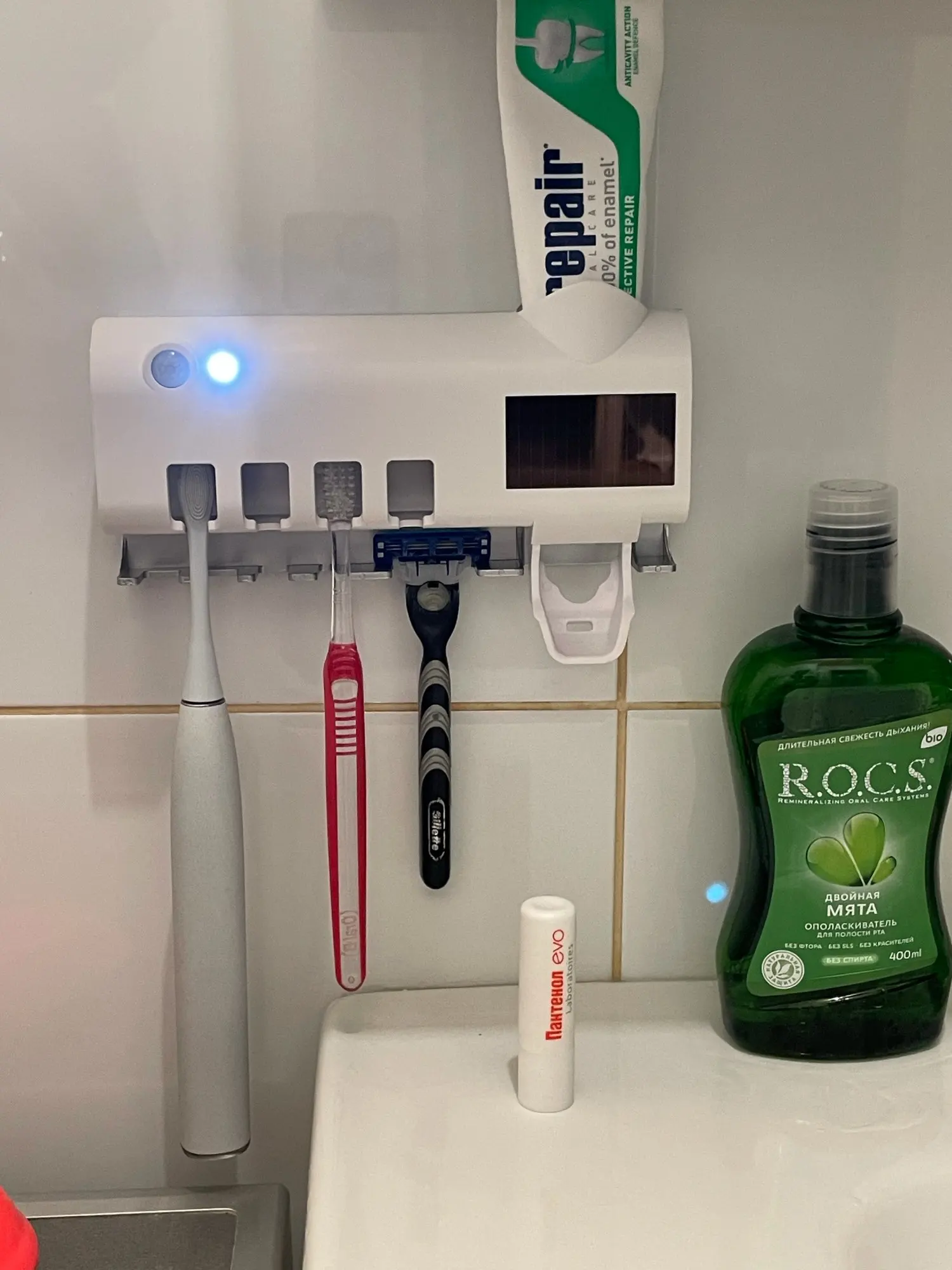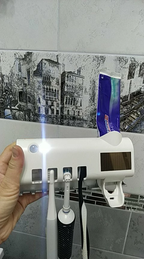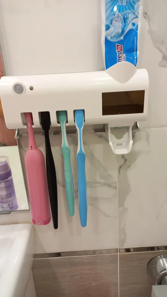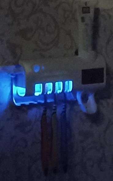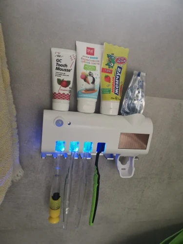 Очень удобная штучка. Как минимум, она держит две электрических щётки, одну простую и тюбик пасты. Это зачёт скотчу)) УФ измерить нечем, светится синеньким, пока никто не видит. По датчику движения отключается. Вот тюбик с пастой еле воткнули, но система подачи работает исправно. Для электрической щётки надо привыкнуть (маленькая головка). Даже, если спектр УФ не осилит стерилизацию, всё равно такой подвес намного гигиеничнее стакана.