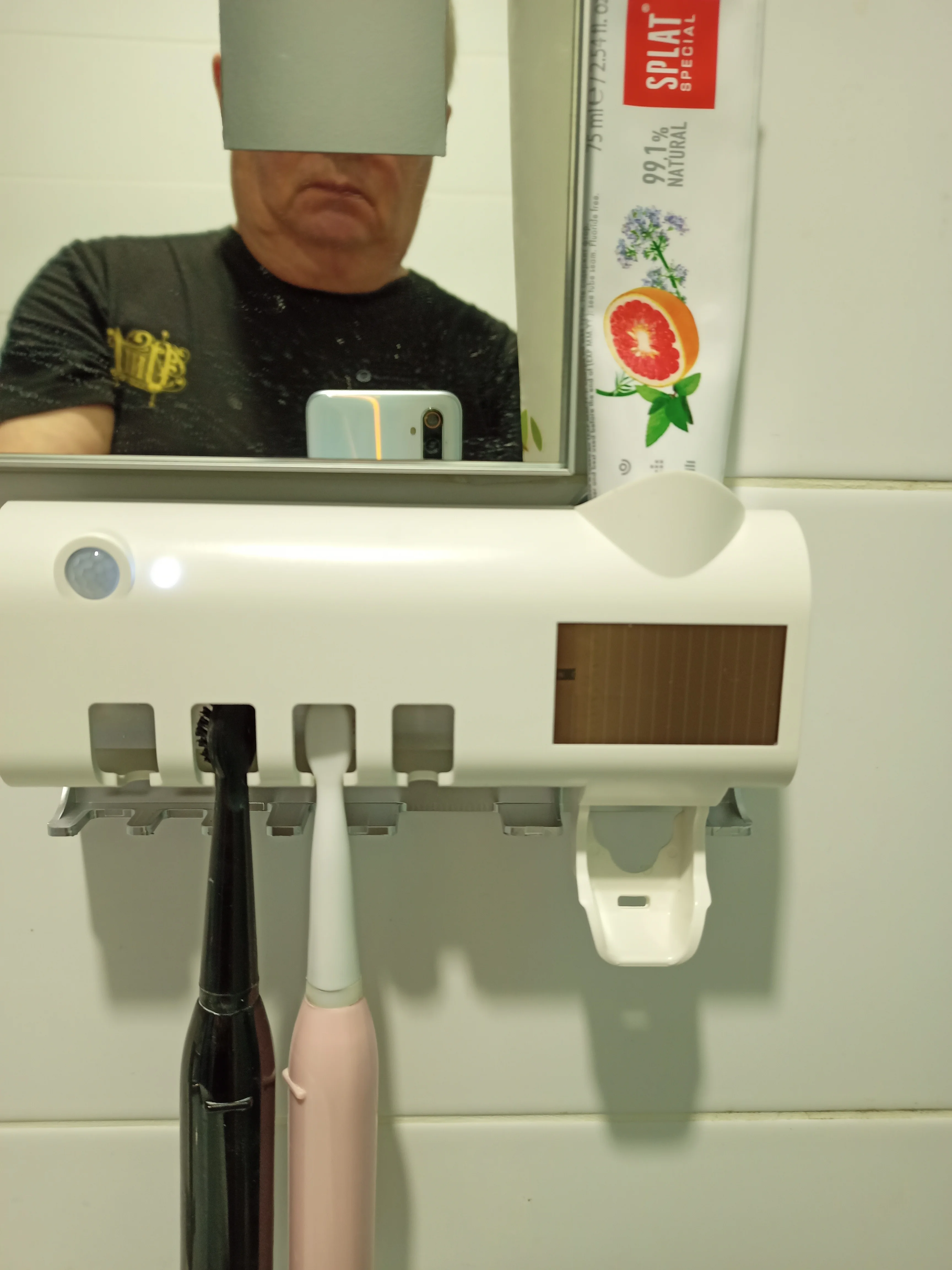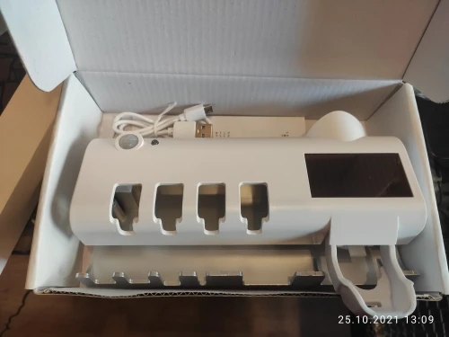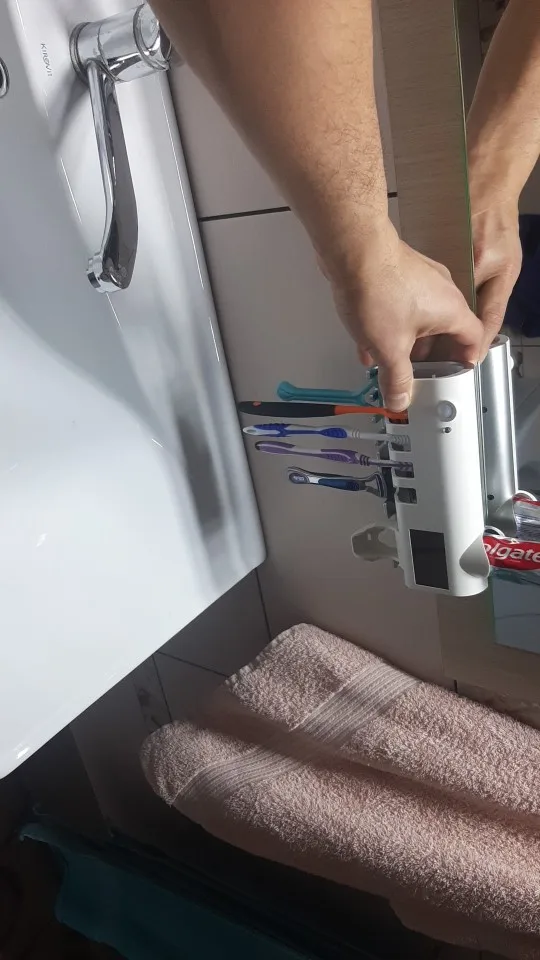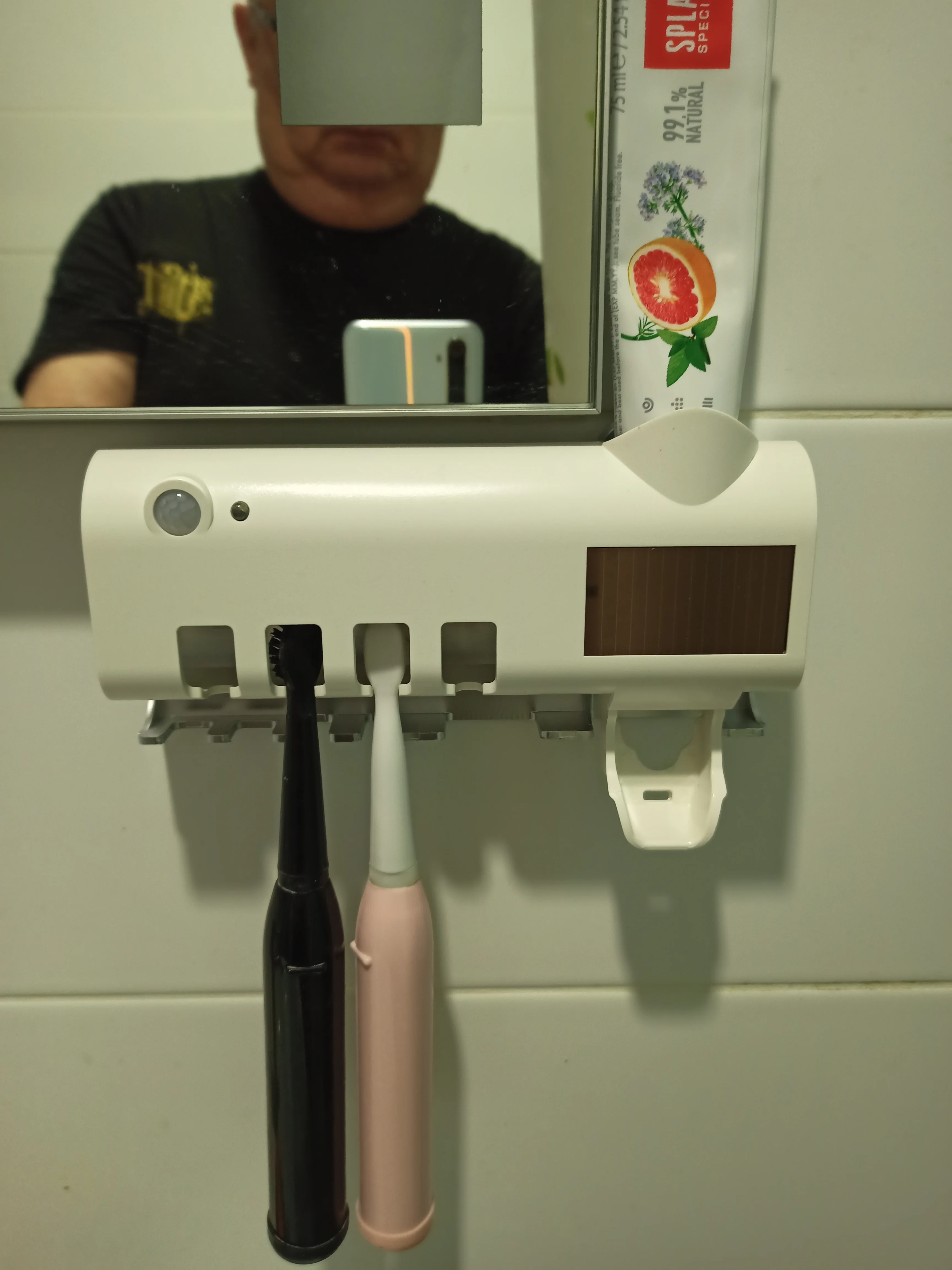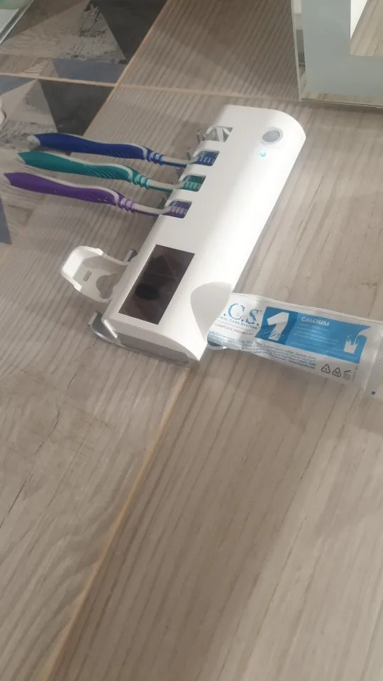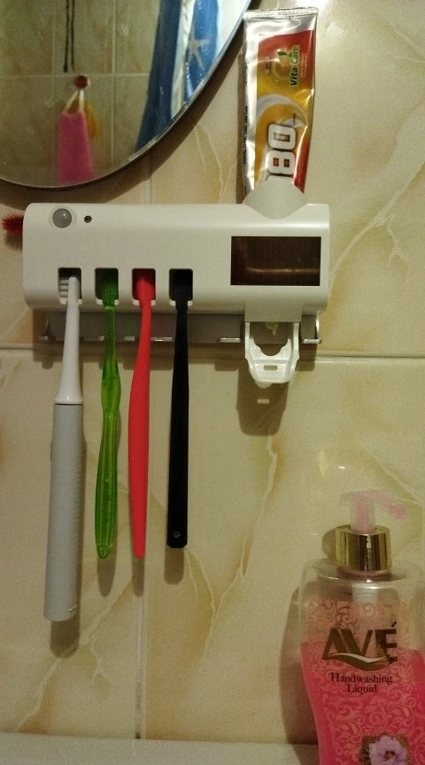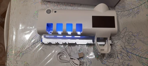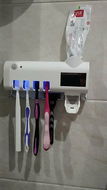 Очень удобная штучка. Как минимум, она держит две электрических щётки, одну простую и тюбик пасты. Это зачёт скотчу)) УФ измерить нечем, светится синеньким, пока никто не видит. По датчику движения отключается. Вот тюбик с пастой еле воткнули, но система подачи работает исправно. Для электрической щётки надо привыкнуть (маленькая головка). Даже, если спектр УФ не осилит стерилизацию, всё равно такой подвес намного гигиеничнее стакана.