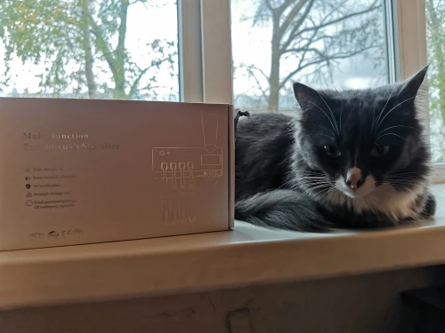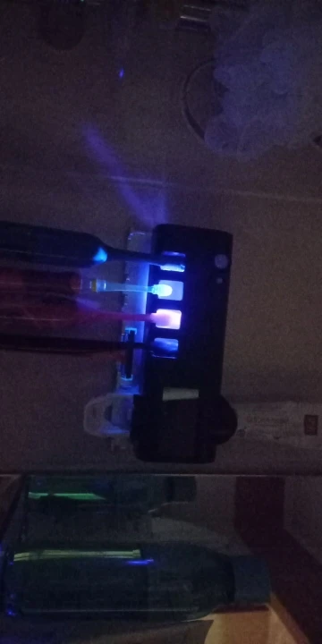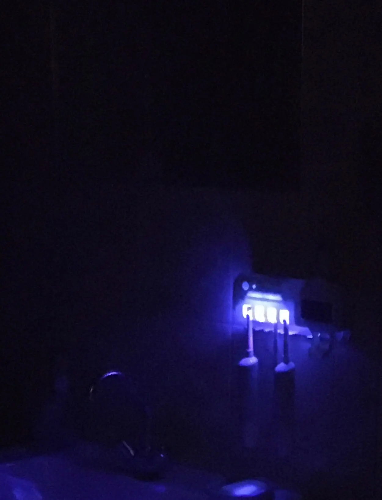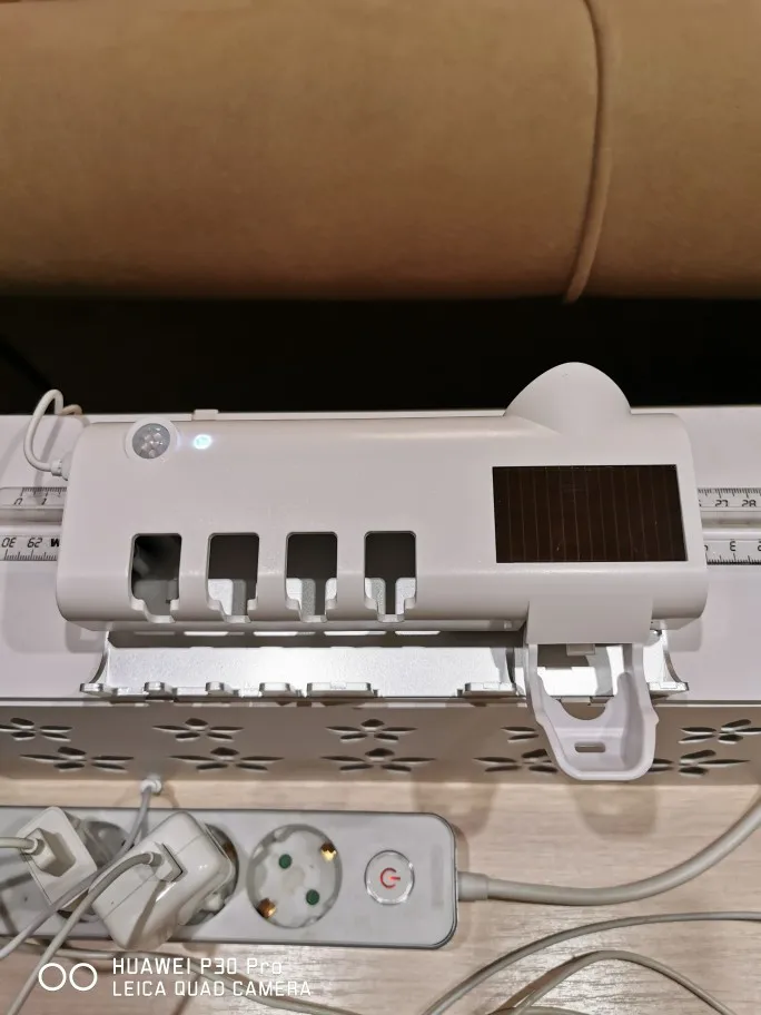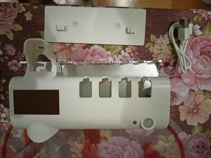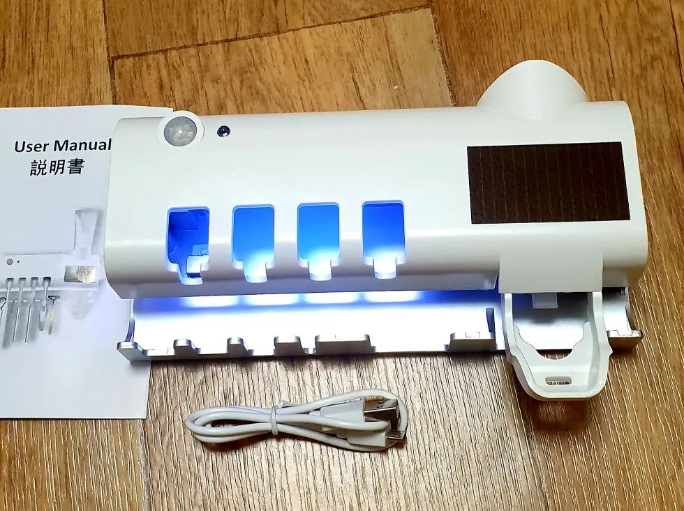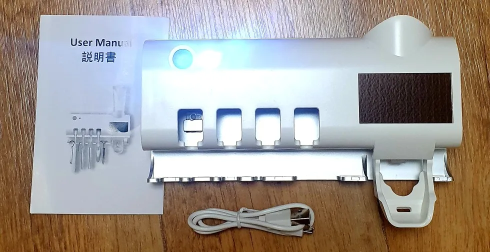 Очень удобная штучка. Как минимум, она держит две электрических щётки, одну простую и тюбик пасты. Это зачёт скотчу)) УФ измерить нечем, светится синеньким, пока никто не видит. По датчику движения отключается. Вот тюбик с пастой еле воткнули, но система подачи работает исправно. Для электрической щётки надо привыкнуть (маленькая головка). Даже, если спектр УФ не осилит стерилизацию, всё равно такой подвес намного гигиеничнее стакана.