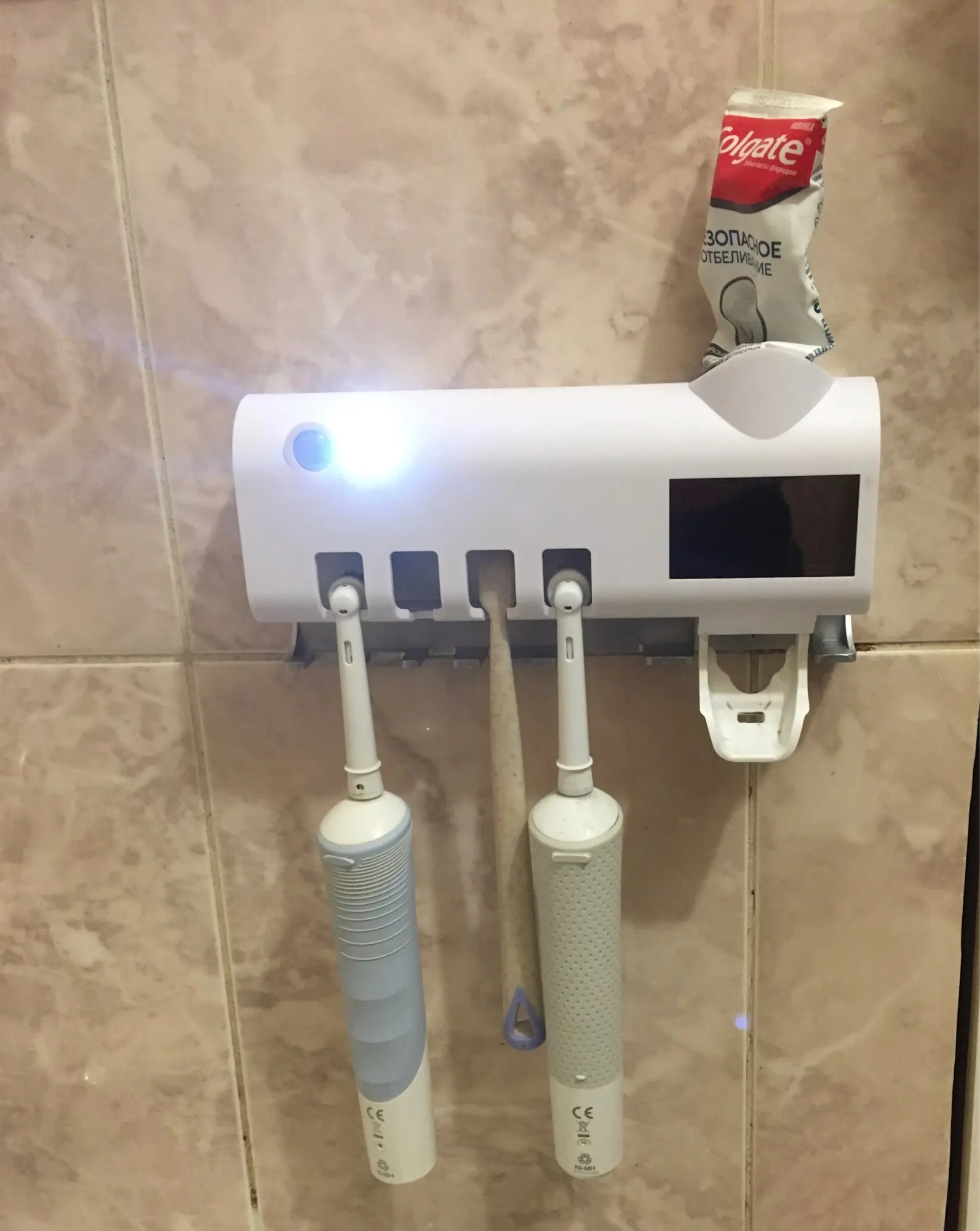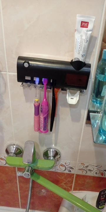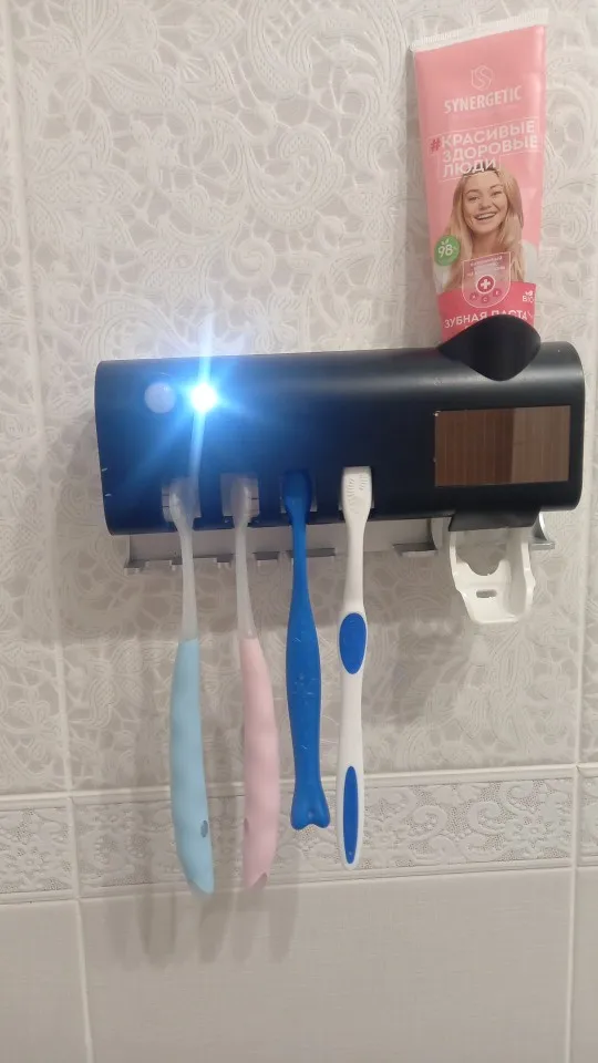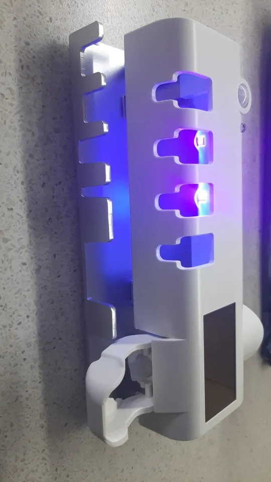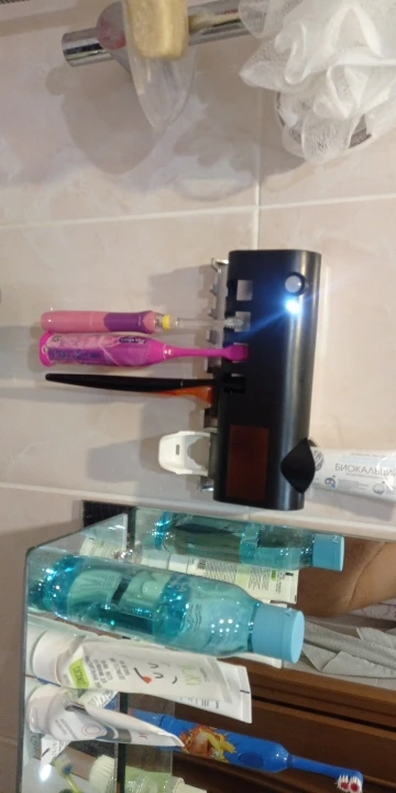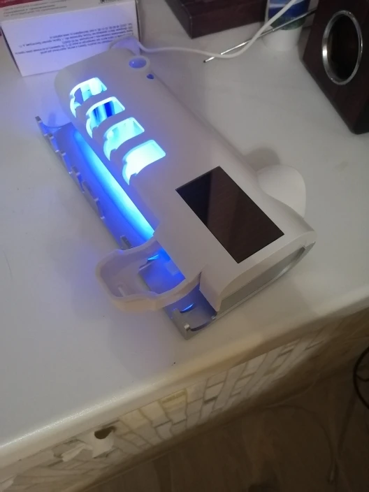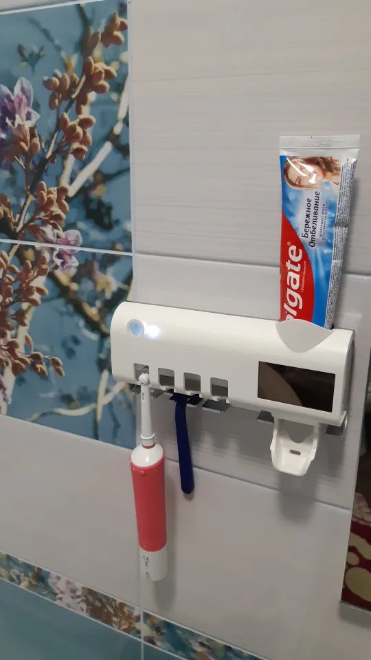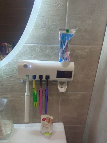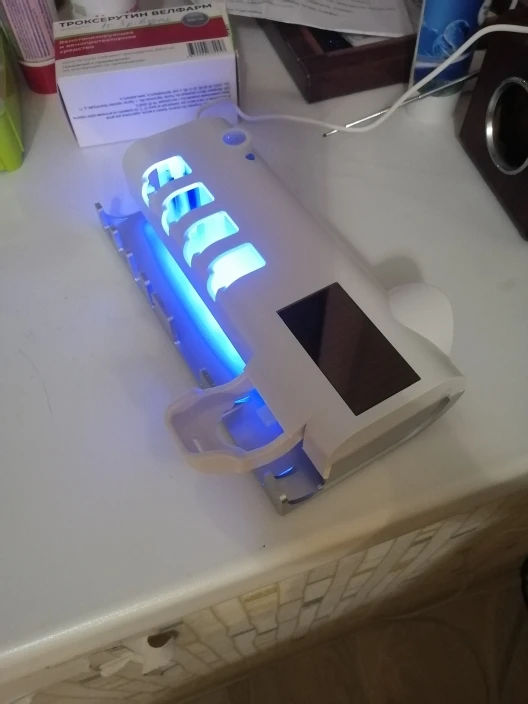 Особенно это устройство понравилось моей дочери. Экономно выдавливает зубную пасту. Очень интересно светится и наверное хорошо обеззараживает зубные щётки и бритвы. Удобно разместить туалетные принадлежности.