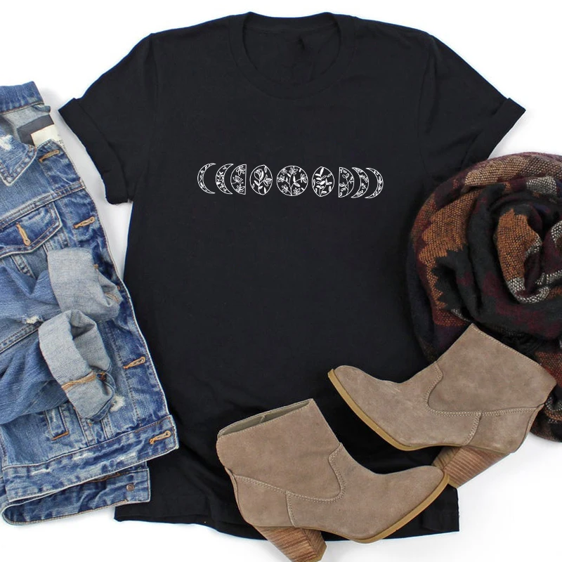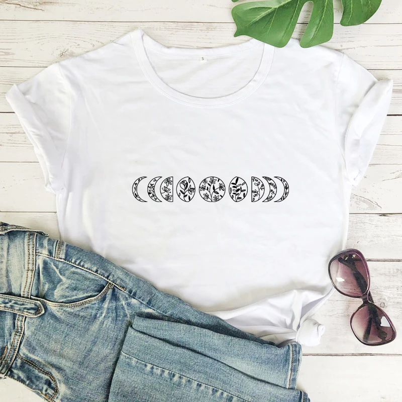 Эстетическое цветочный фазы Луны футболки Для женщин ретро Boho полумесяц Пособия по астрономии футболка просто фазы для привлекательных Графический Футболка