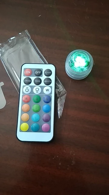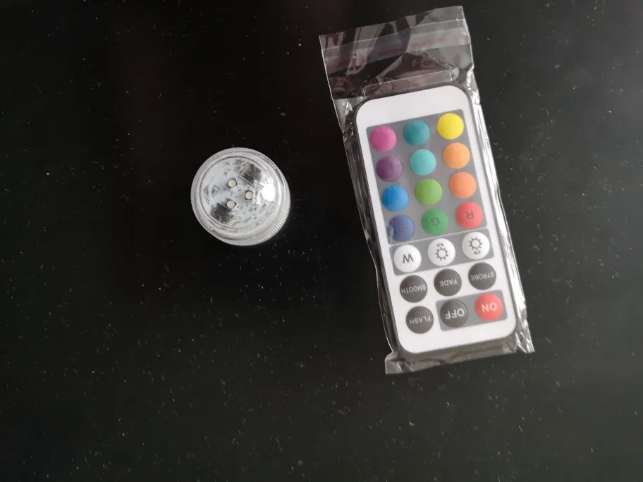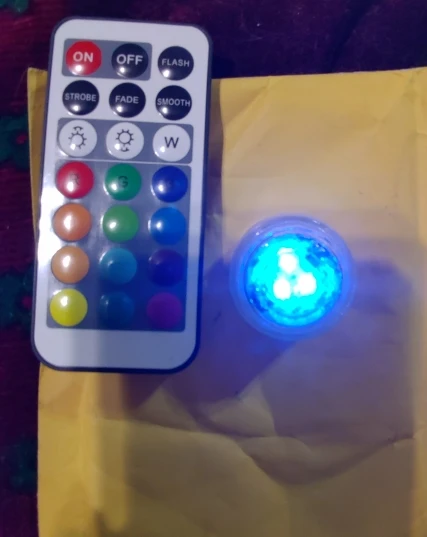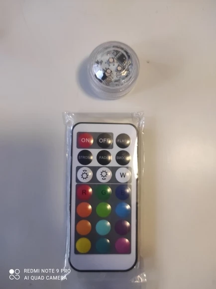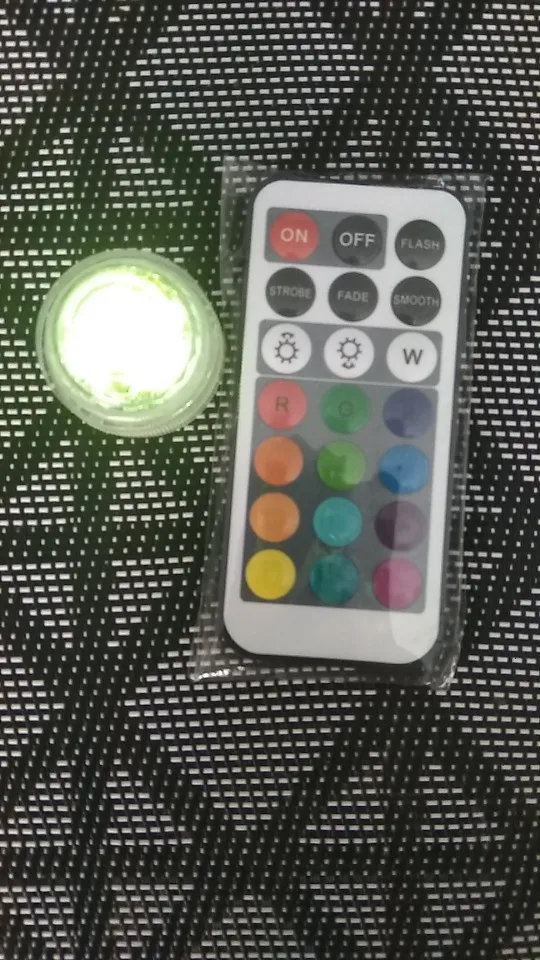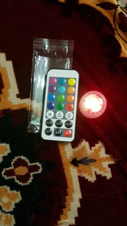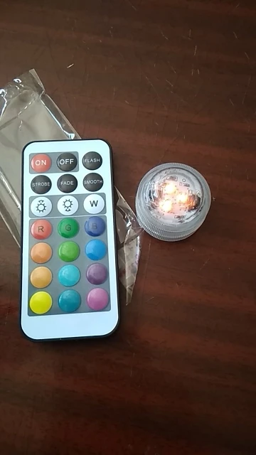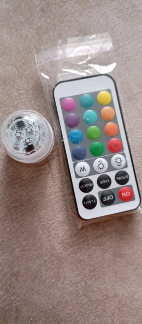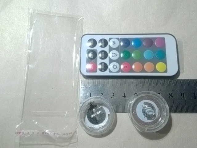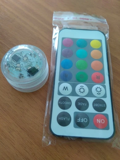 Доставка 19дней с момента отправки. Упаковано в желтый конверт с внутренней пупыркой, пульт в пакетике, батареек в комплекте нет, но в пульте есть защитная пленка в отсек батарейки. Мой светильник до конца не завинчивался, мешал сильно выступающий боковой усик плюсового контакта, пришлось его распрямить, а потом снова загнуть. На резьбе есть уплотнительная резинка, под водой думаю работать будет. В комплекте батареек нет, подошли к пульту и светильнику CR2032 -3V, хотя на обратной стороне светильника написано CR2025. Светит не очень ярко, но зато не будет сильно разряжаться батарейка и в воде свет будет распространятся по другому. Можно попробовать применить в аквариуме, или банке с водой. Режимов переключения с пульта много: вкл/выкл, регулировка яркости, просто мигание, переливы, мигание разными цветами, можно включить разные цвета, кроме чисто белого. После отключения запоминается последний режим и затем включается с него. Цена минус купон продавца(1$) = 6,85рублей.