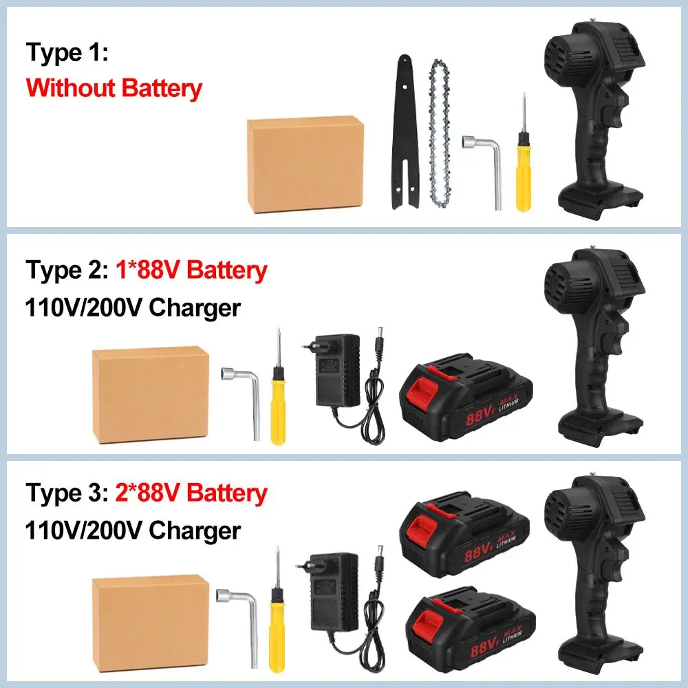 Посылка включает в себя:1 хост1 x цепь1 x направляющая пластина2/1/без батареи1 х гаечный ключПосылка включает в себя:Тип 1 (без аккумулятора)1 хост1 x цепь1 x направляющая пластина1 х гаечный ключ1 отвертка1 х упаковочная коробкаТип 2(1 шт. аккумулятор)1 хост1 x цепь1 x направляющая пластина1 x литий-ионный аккумулятор1 х гаечный ключ1 отвертка1 зарядное устройство (110 В/220 В)1 х упаковочная коробкаТип 3 (2 шт. батареи)1 хост1 x цепь1 x направляющая пластина2 x литий-ионная батарея1 х гаечный ключ1 отвертка1 зарядное устройство (110 В/220 В)1 х упаковочная коробка