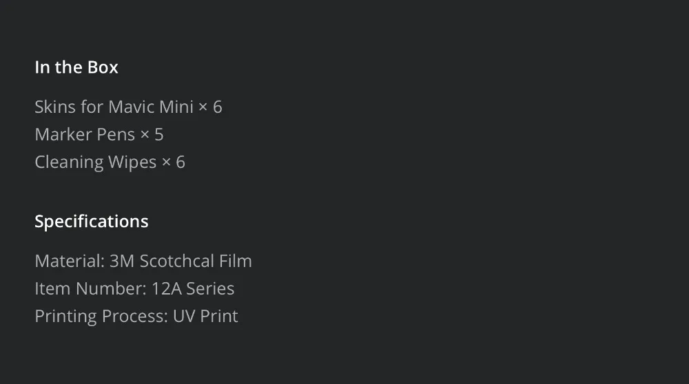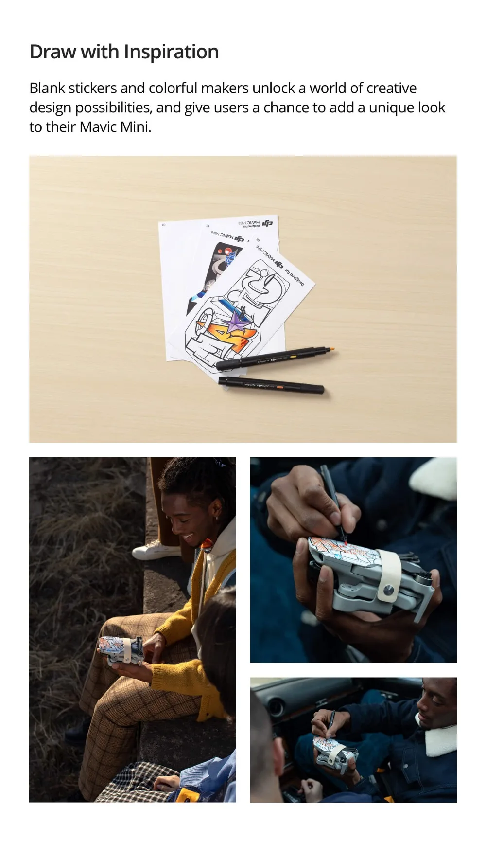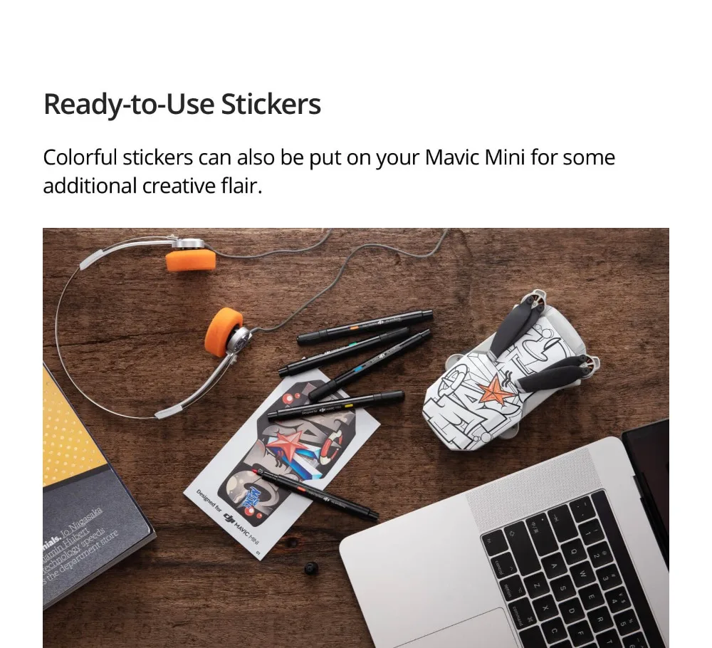 В комплекте пустые наклейки в виде ракушек и красочные маркеры, которые позволяют пользователям персонализировать Mavic Mini.