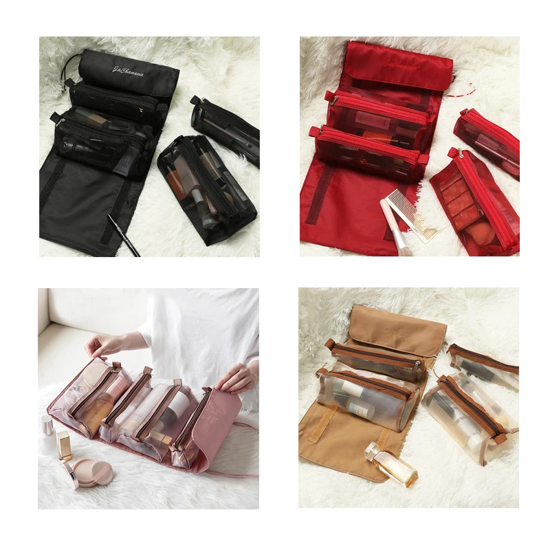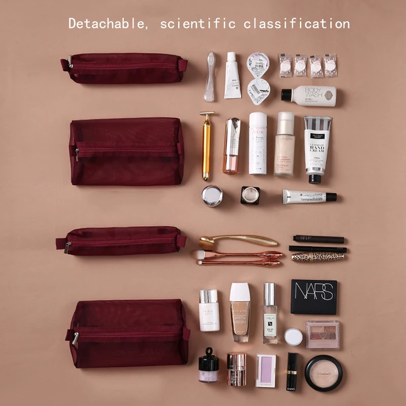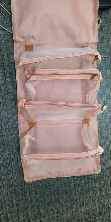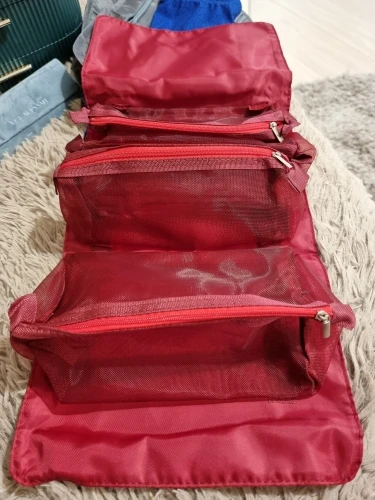 Качественная косметичка, очень вместительная. Цвет как заявлен, швы ровные, сеточка плотная. Блоки съёмные. Рекомендую к покупке. Единственное, не знаю, на сколько хватит основных резинок, закрывающих косметичку, насколько быстро растянутся.