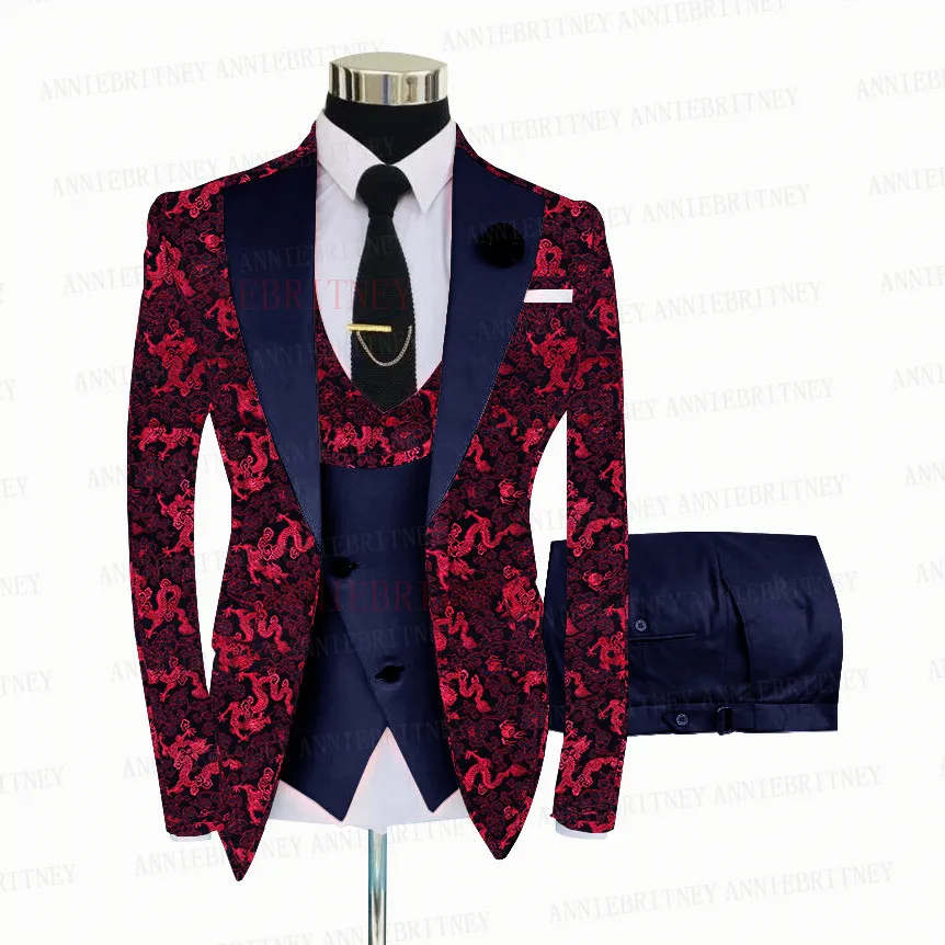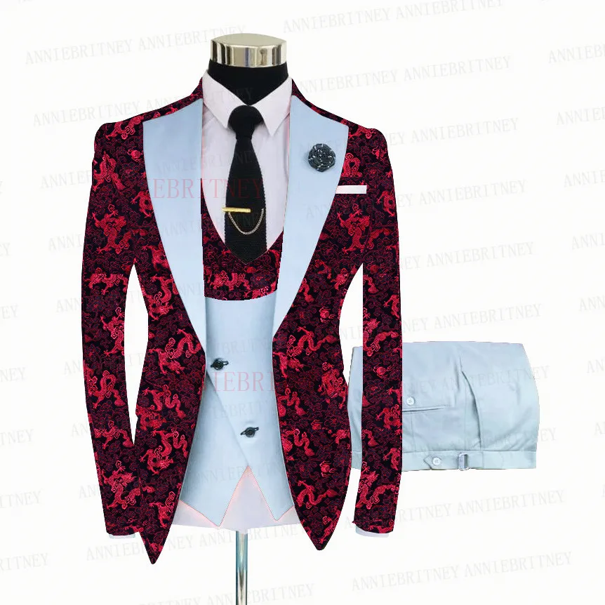 Жаккардовый костюм для мужчин из 3 предметов, приталенный пиджак, д...