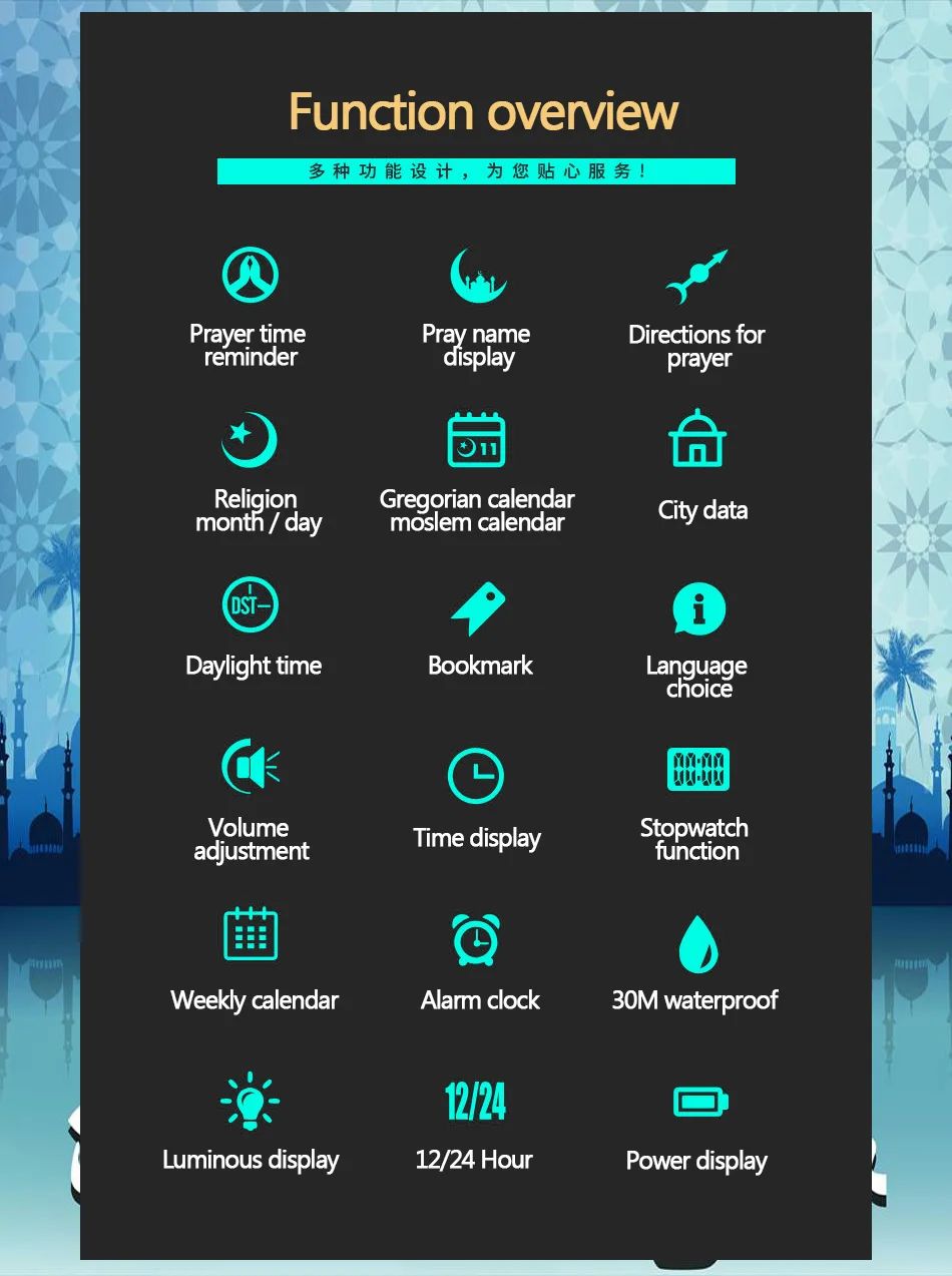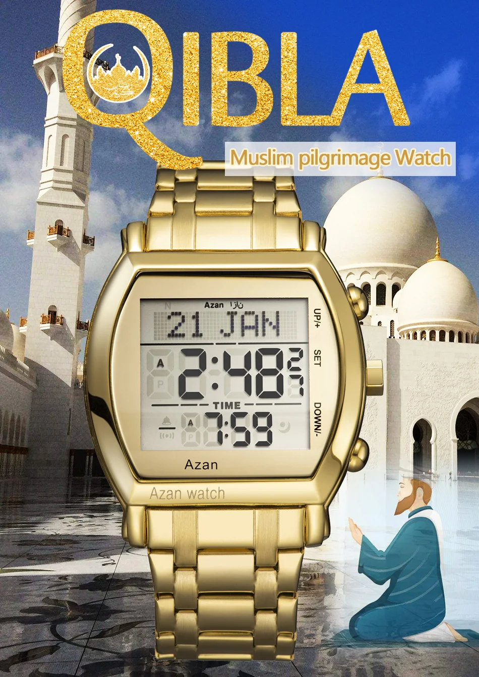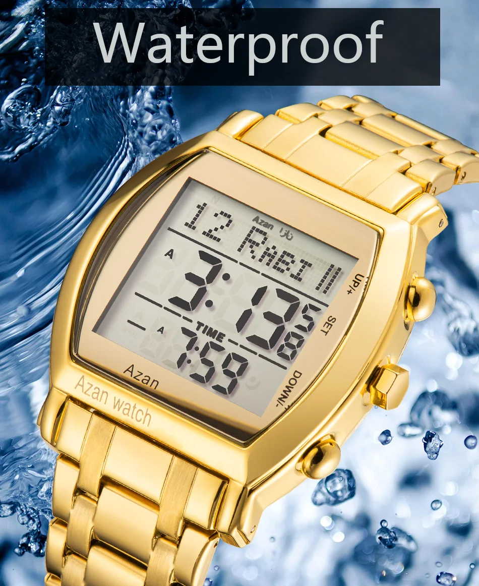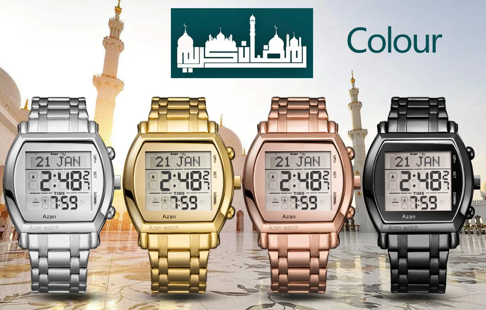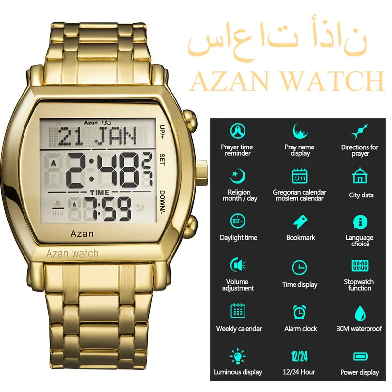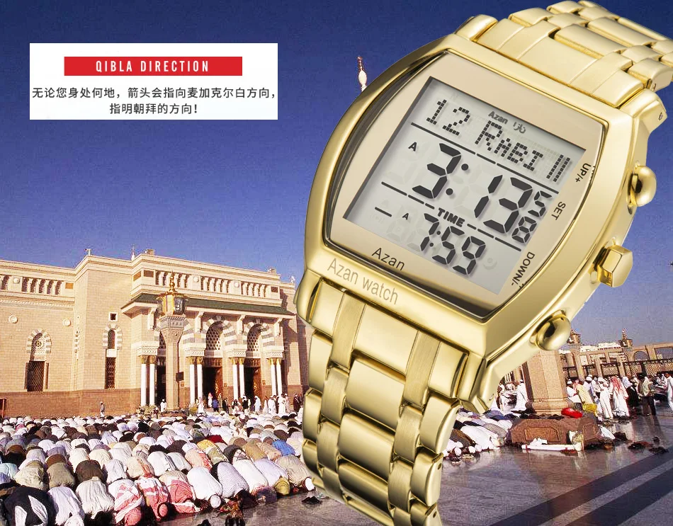 Новое поступление 2021 мусульманские молитвенные Часы montre розовое золото нержавеющая сталь исламские Azan наручные часы цифровые светодиодные часы 6007