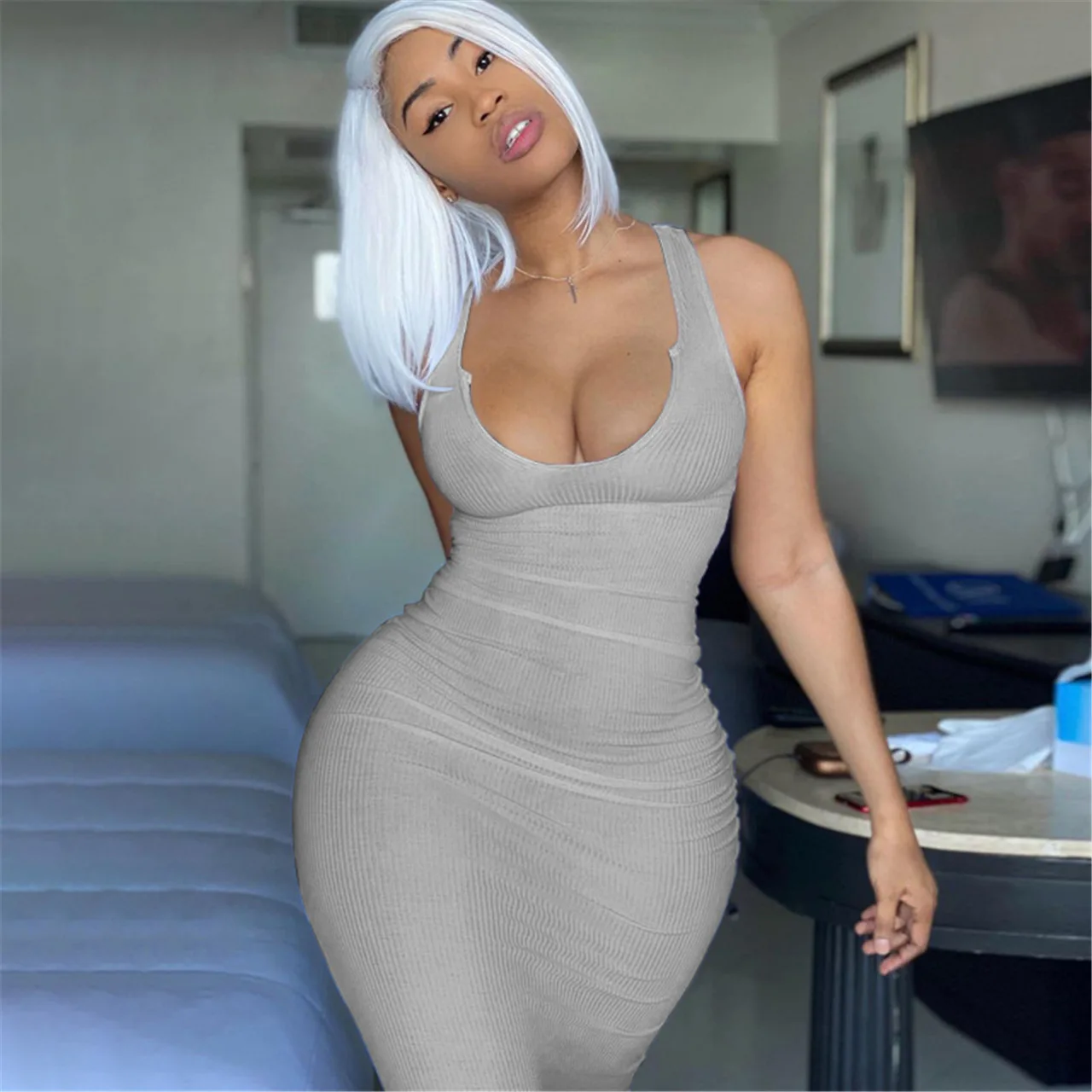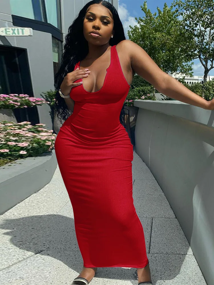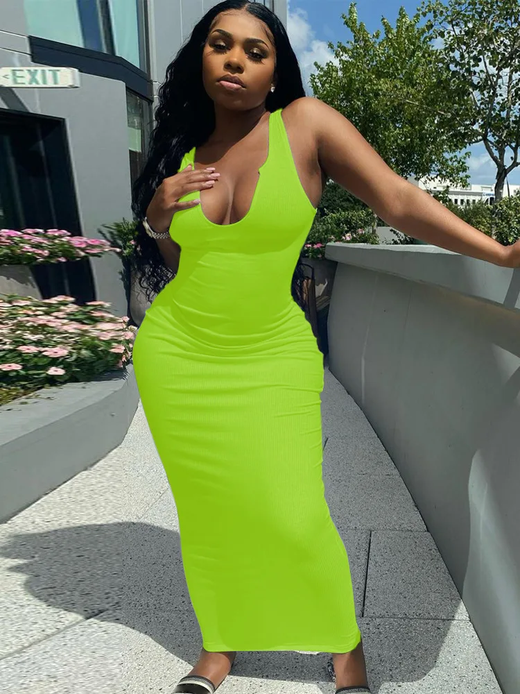 Женское трикотажное облегающее платье-макси, эластичное длинное платье-карандаш средней длины без рукавов и с V-образным вырезом в рубчик, новинка 2021