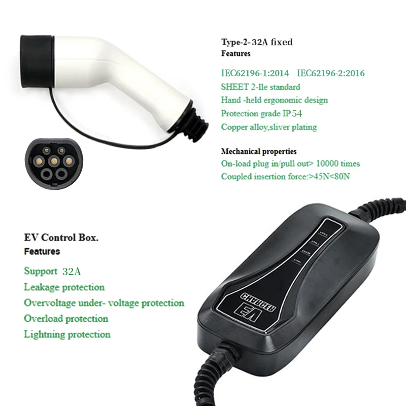 1. Разъем для зарядки: 7 контактов (соответствует стандарту IEC 62196-2)2. Разъем питания: штепсельная вилка Schuko3. Длина шнура зарядного устройства: 5 м4. Номинальное Напряжение: 220/250V5. Номинальный ток: 32A6. Рабочая температура: -30 ℃ ~ + 55 ℃7. Рекомендуется использовать в помещении8. CE признанный компонент