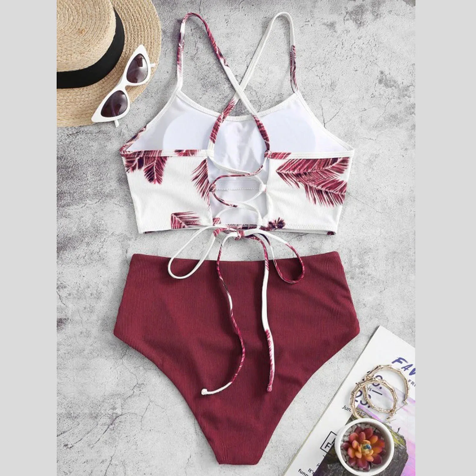 Женский купальник из двух частей с принтом в виде листьев Разделение наборы размера плюс пляжный купальник бикини для девушек, модная летняя модель, Повседневная купальный костюм