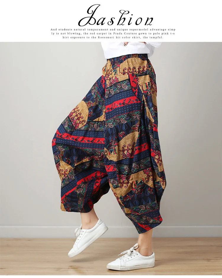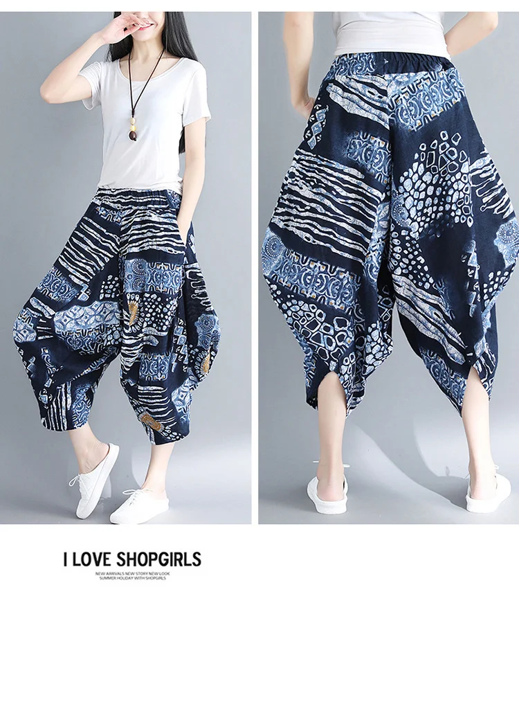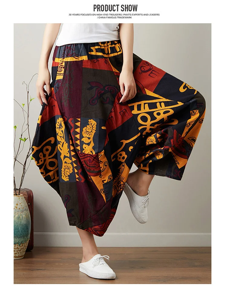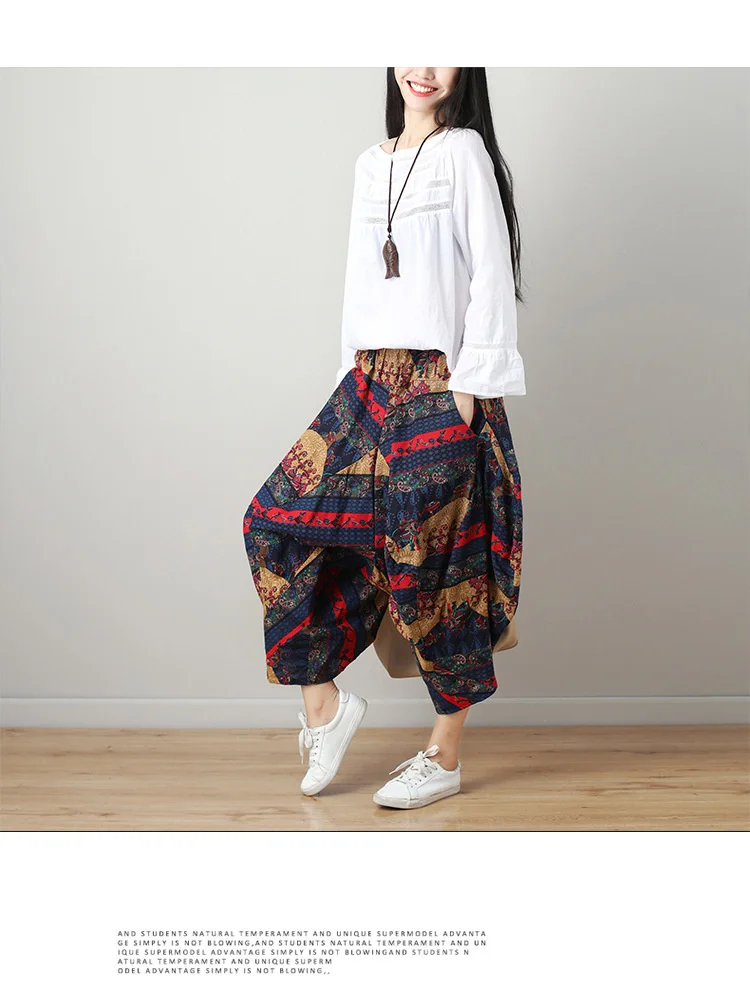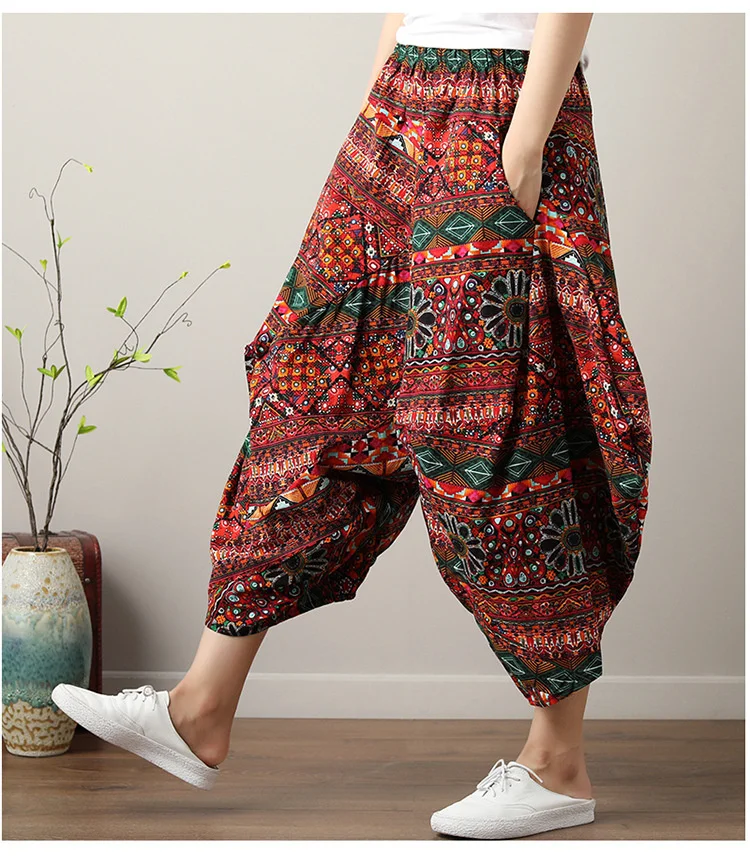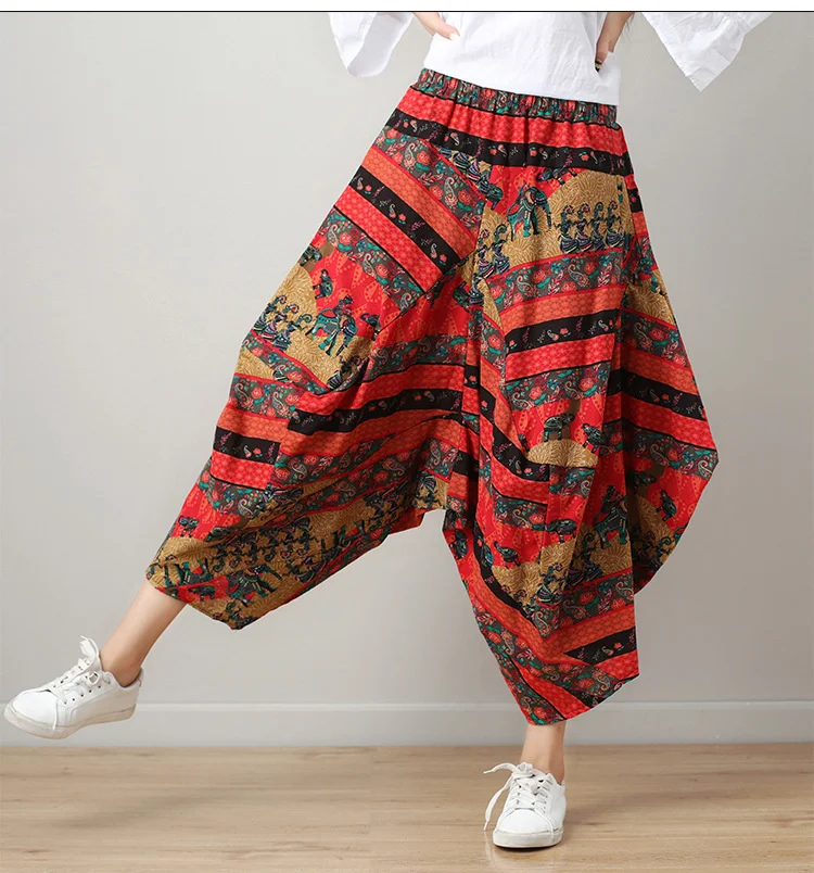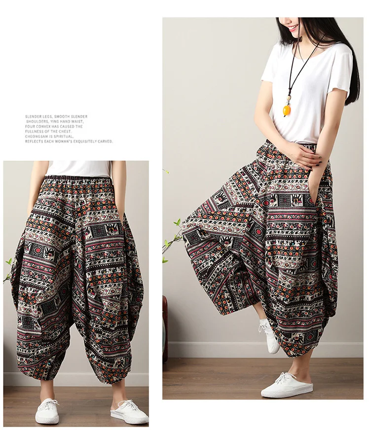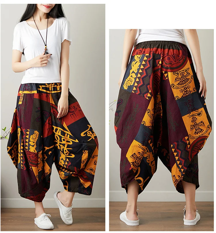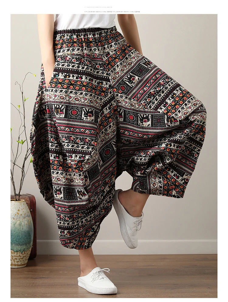 Хиппи одежда для женщин в богемном стиле с принтом штаны Летние каникулы брюки 70s женские зимние винтажные сапоги в этническом стиле, штаны с эластичной резинкой на талии для мальчиков повседневные Хлопковые Штаны