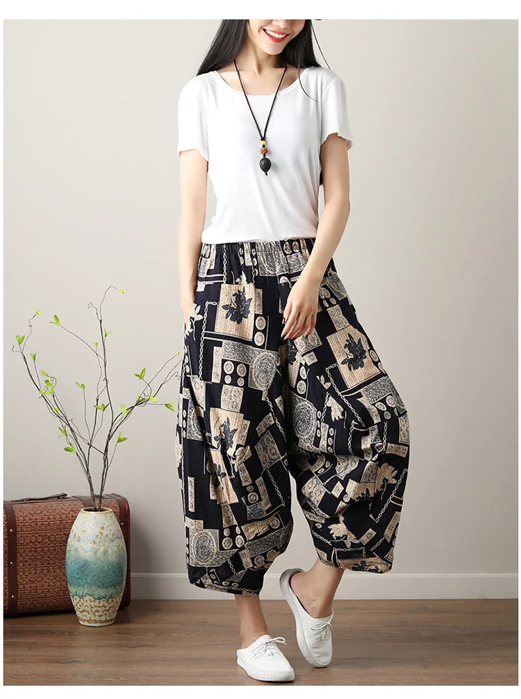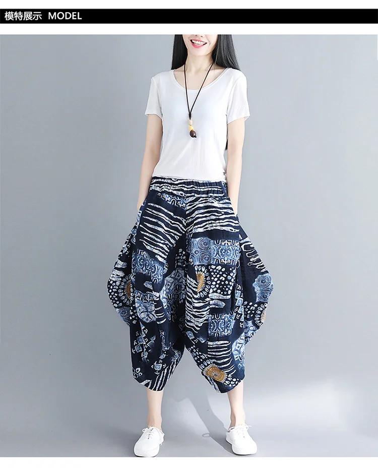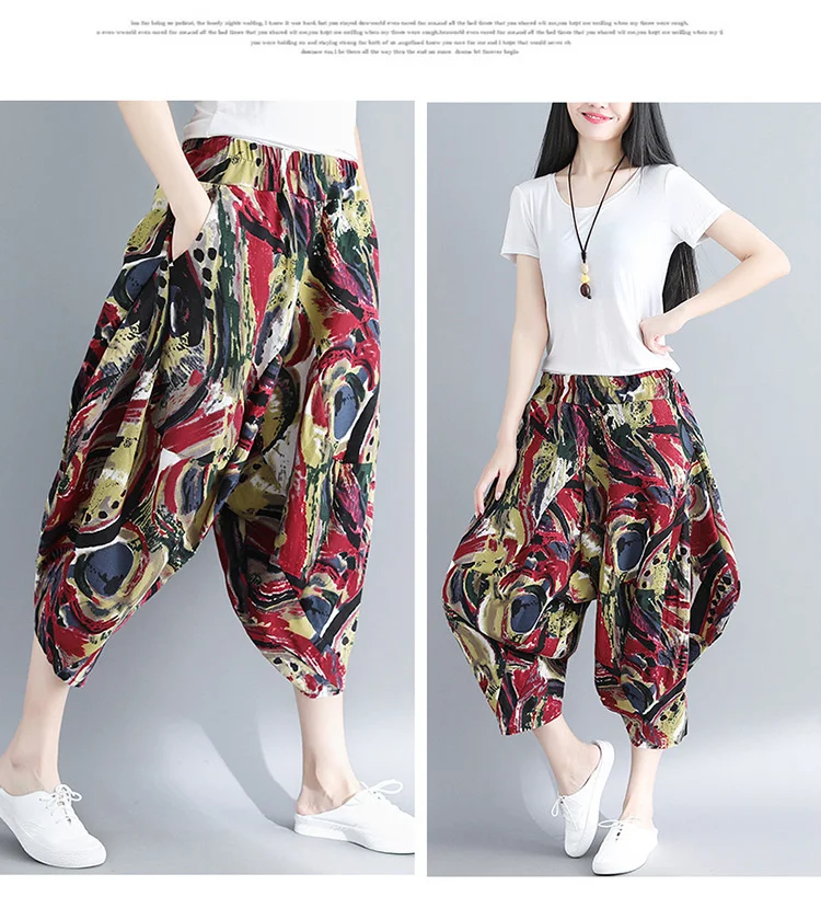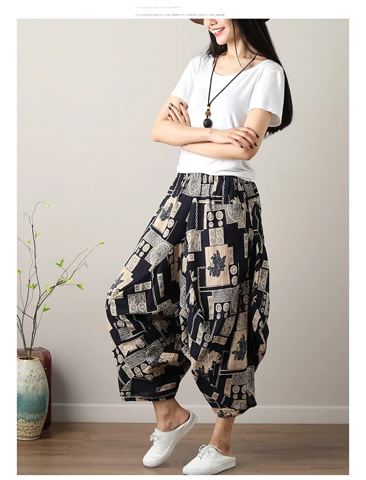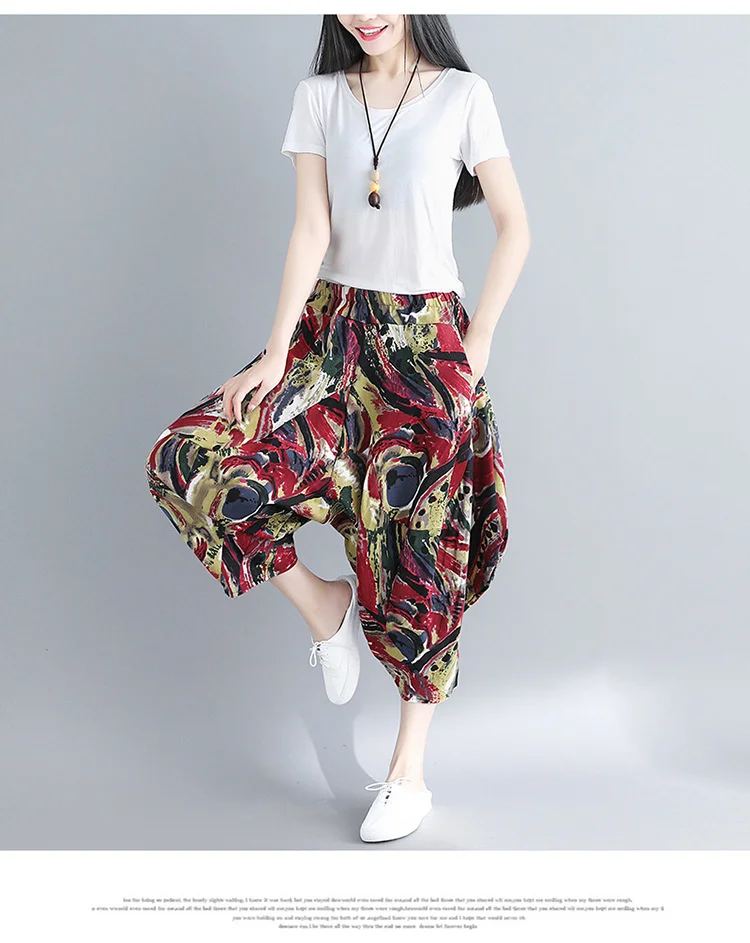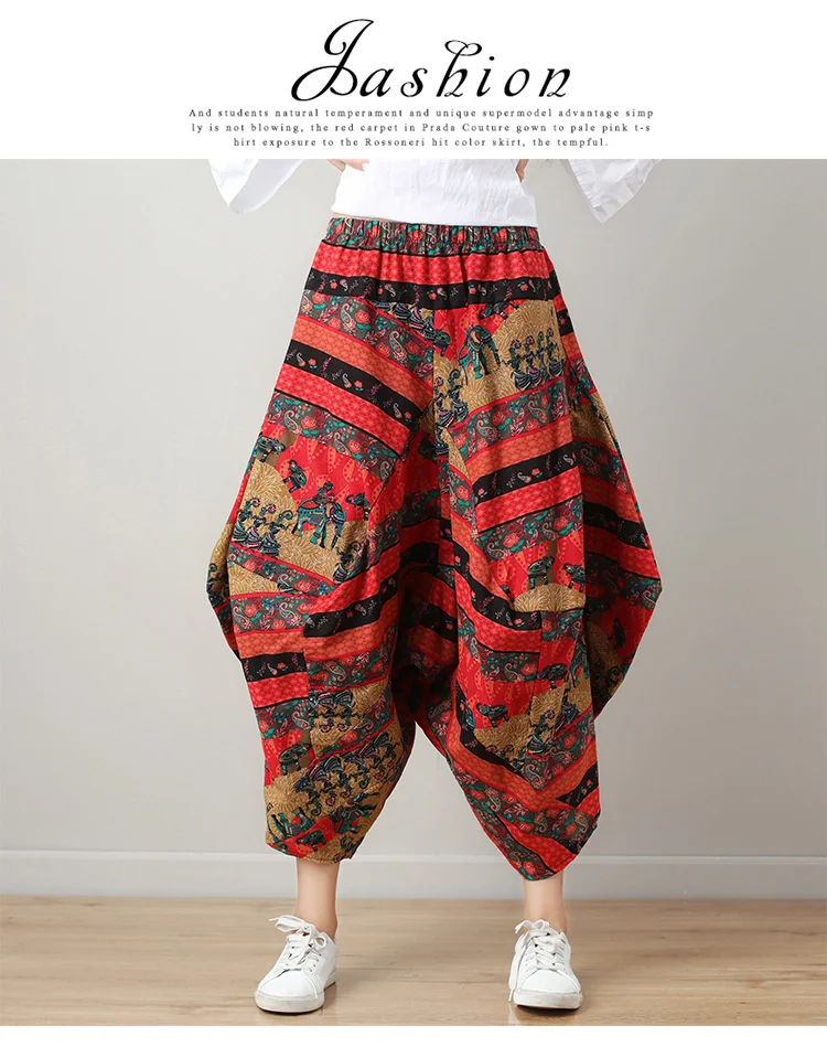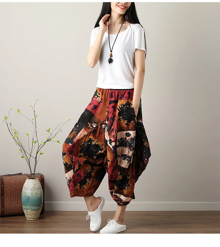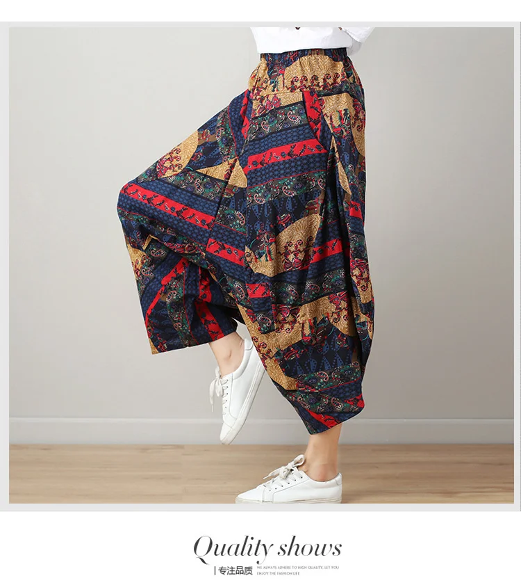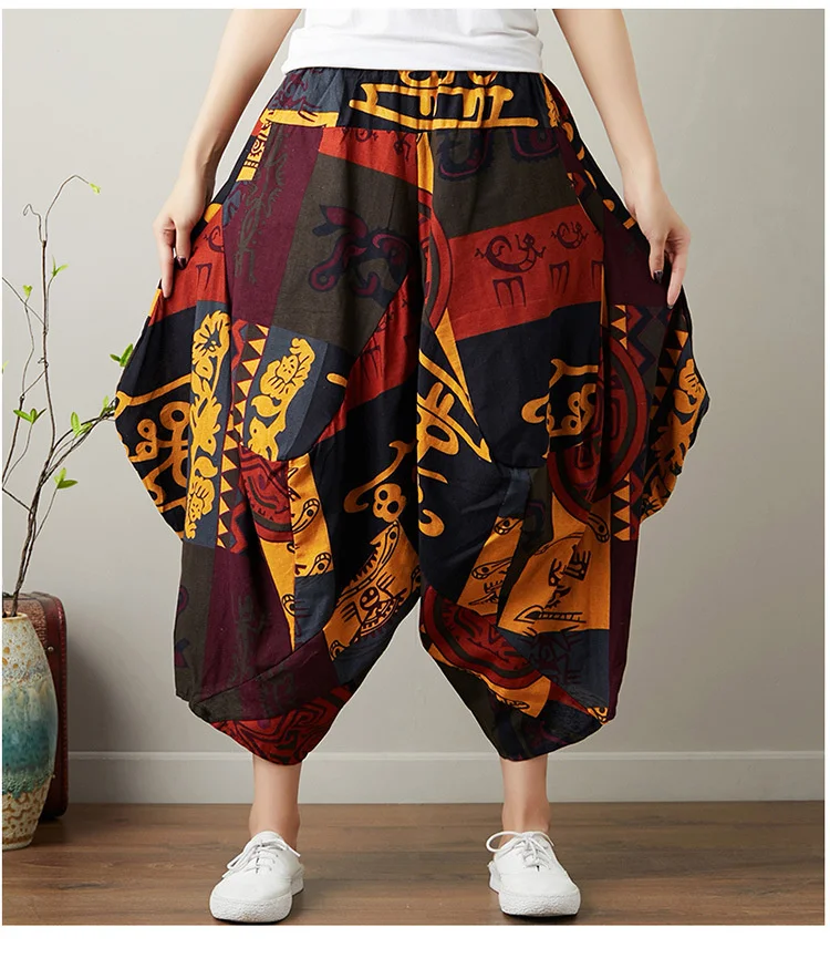 Хиппи одежда для женщин в богемном стиле с принтом штаны Летние каникулы брюки 70s женские зимние винтажные сапоги в этническом стиле, штаны с эластичной резинкой на талии для мальчиков повседневные Хлопковые Штаны
