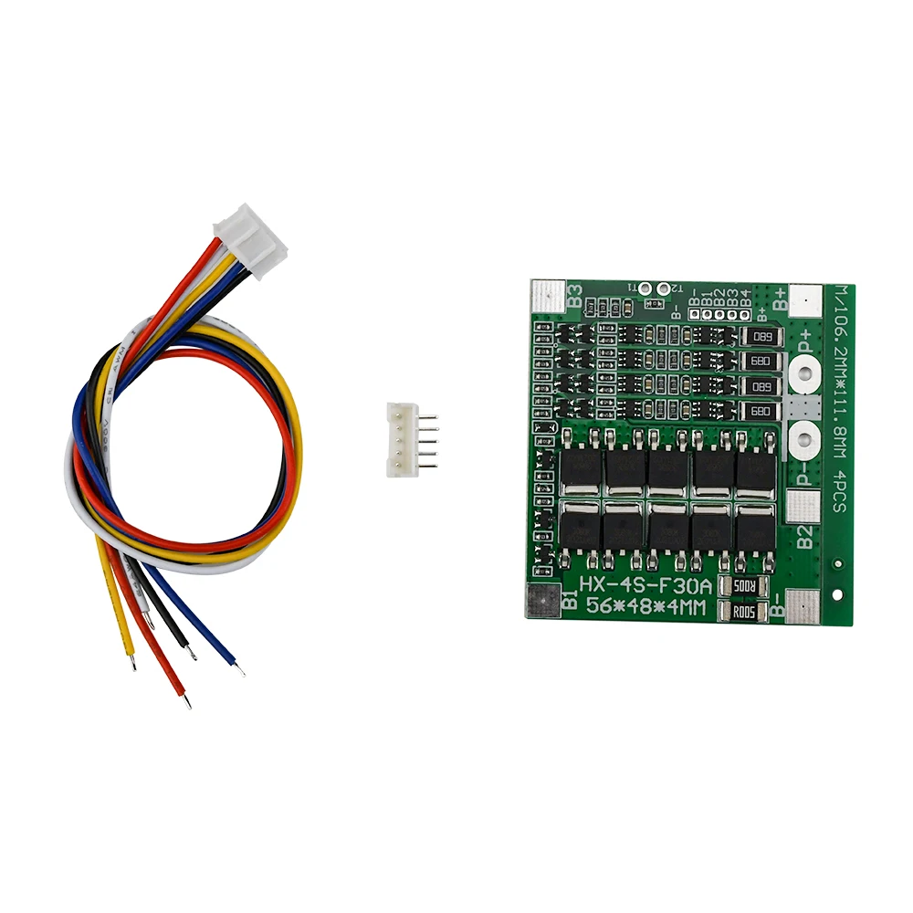 4S плата защиты литиевой батареи (14,8 в/30A):Модель: 4S 30AТехнические характеристикиЗащита от перезарядки обнаружения напряжения: 4,28 + 0,05 VНапряжение зарядки: 4,095-4,195 вЗащита от разрядки напряжение: 2,55 ± 0,08Защита от перезарядки время задержки обнаружения 0,1 sДиапазон температур-30-80Время задержки обнаружения короткого замыкания: 100 мсВремя задержки обнаружения по току: 500 мсСбалансированный ток: 60 мАРабочий ток: 30AПерегрузки по току: 60AФункция защиты от короткого замыкания: есть, отключение нагрузки может быть самовосстановлением.Размер: 45х56ммОсновная функция:Защита от перезарядки, защита от разрядки, защита от короткого замыканияФункция, защита от перегрузки по току, баланс.Описание интерфейса:Порт зарядки пластины и порт разрядки одинаковые, как положительные, так и B-подключениеАккумулятор "-", порт P- charging и порт на отрицательном электроде;B-N-, P-колодки находятся по всему отверстие, диаметр отверстия колодка 3,5 мм;Интерфейс обнаружения зарядки аккумулятора с выходом постоянного тока в виде иглы. Сделайте тот же самый ротКогда N-не проводка.