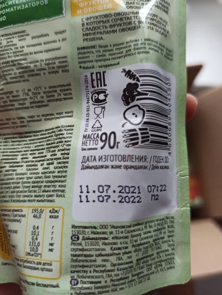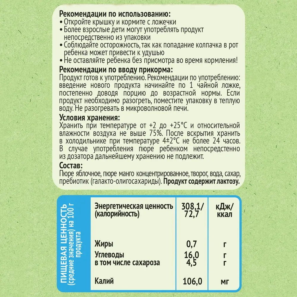 РЕКОМЕНДУЮ К ПОКУПКЕ. Пюре этого бренда всегда отличное по качеству. Вкус приятный. Манго чувствуется,правда консистенция немного жидковата. Дата срока годности 25.04.22 г. Куплено 11 ноября по акции 3=2. 29.96*4=119.84 коп. Оплата по факту 80 руб. 29 коп. за 4 шт. 1 шт. около 20 руб. Доставлено за 5 дней в 5 Post 16 ноября.