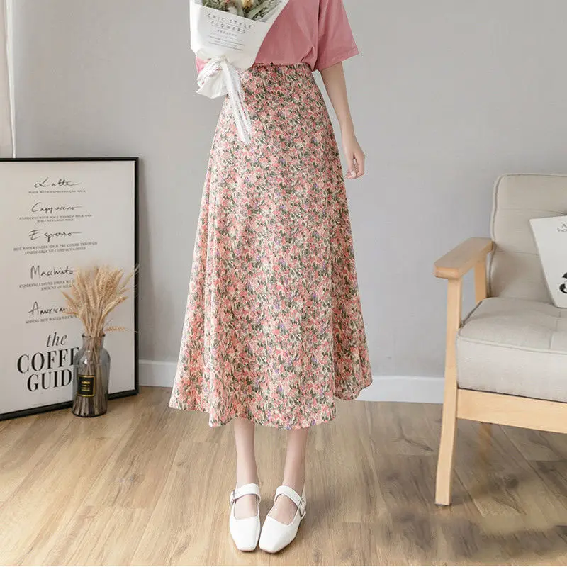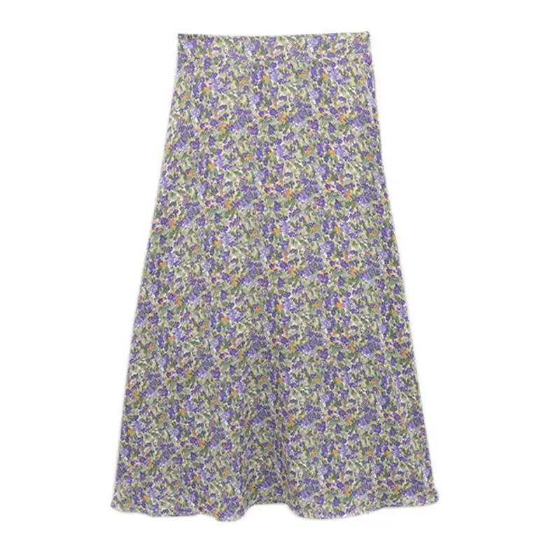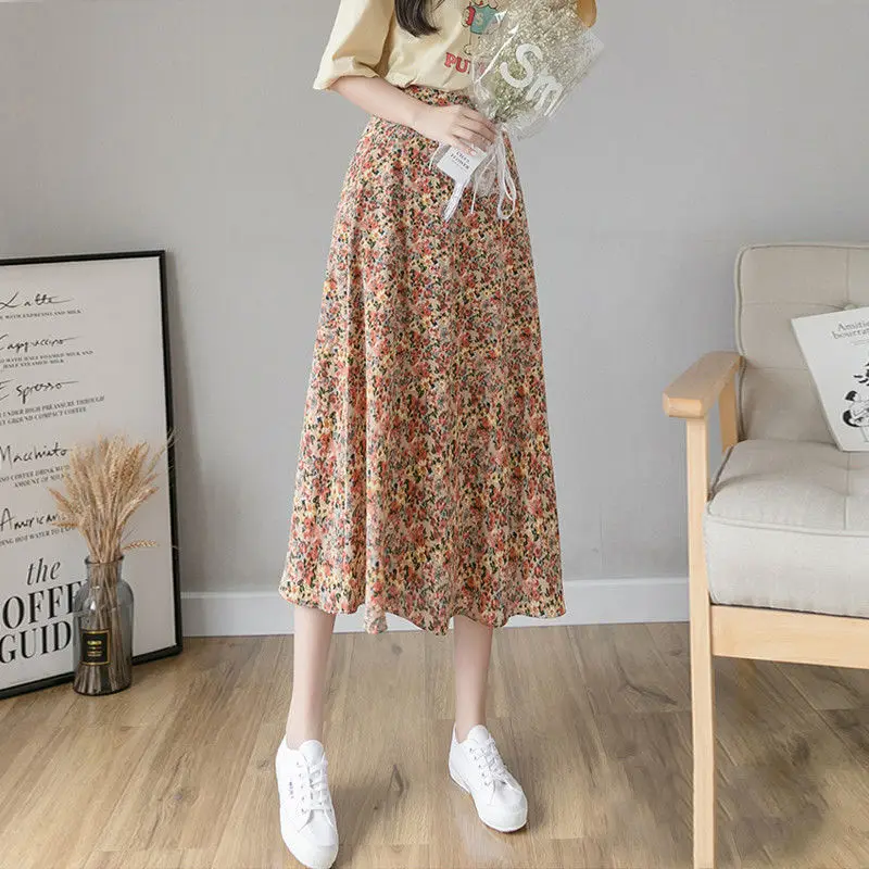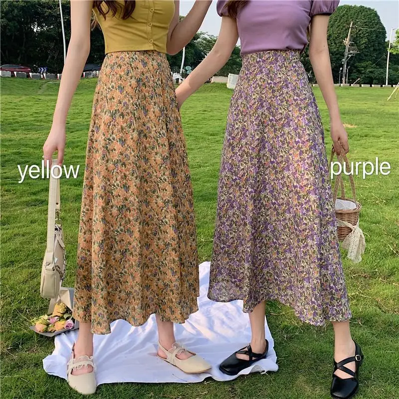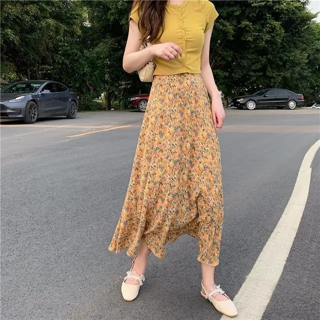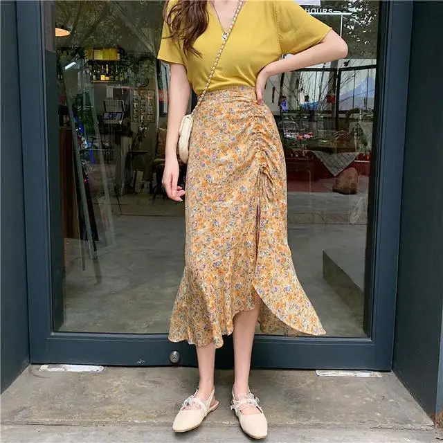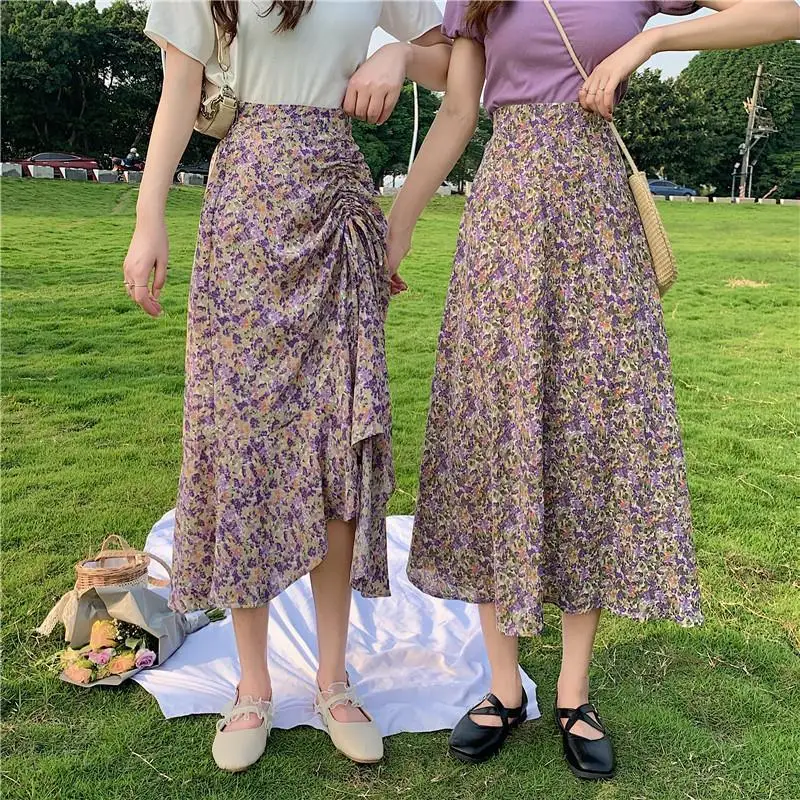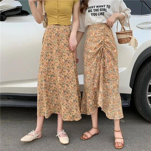 Женская плиссированная юбка JuneLove, винтажная длинная юбка с цветочным принтом и оборками, Корейская уличная одежда, миди-юбка на шнуровке с эластичным поясом на лето