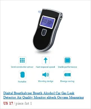 Высокая точностьДва единицы дисплея: °C & g/lАвтоматическое отключение питанияБыстрый ответ и возобновлениеДиапазон обнаружения: 0,00 ~ 0.19% BAC и 0,0 ~ 1,9g/lПитание от 2 щелочных батарей AAA (не входят в комплект).Свойства продукта:Бренд: noМодель: PFT-641Характеристики:Тип: Тестер спирта для дыханияIs_customized: нетРазмер: 95*36*16 ммВес нетто: 23 гПосылка Вес: 33 грЦвет: белыйСодержание упаковки:1 x Цифровой тестер дыхательного спирта1 х руководство на английском языке1 x ремешок