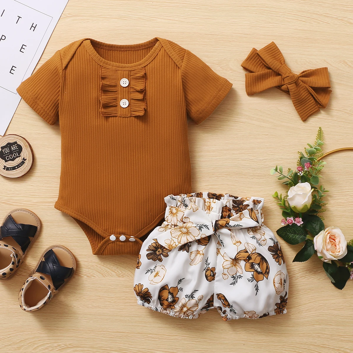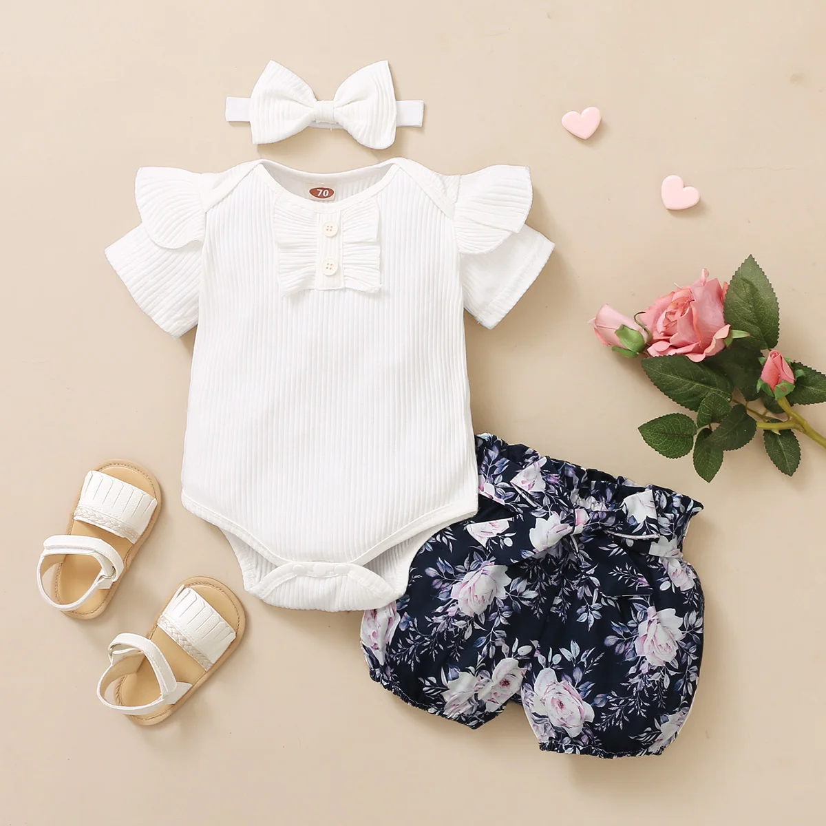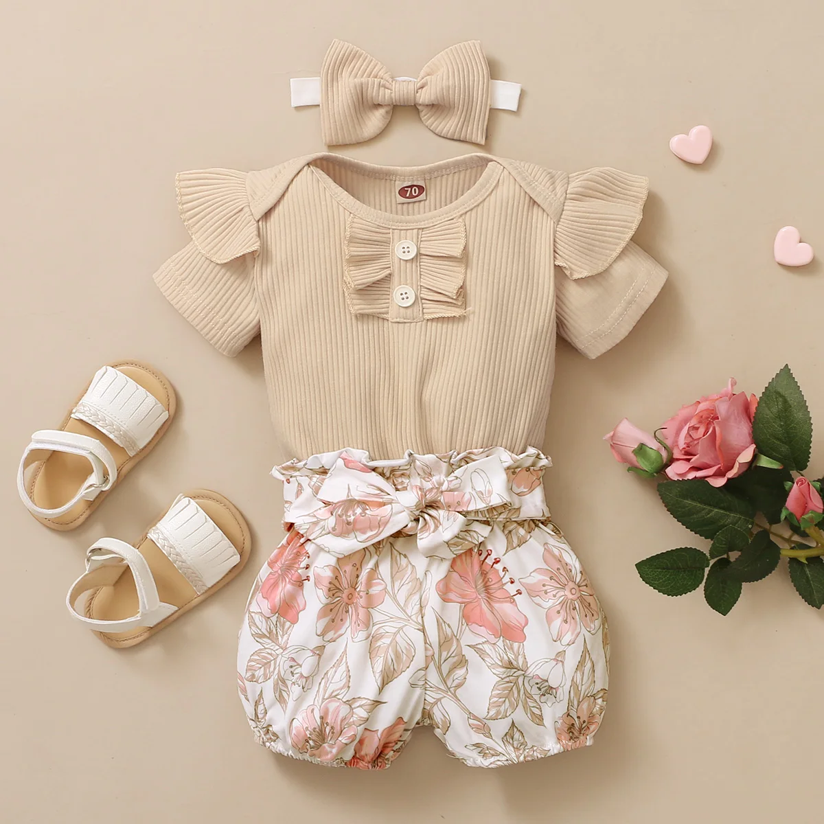 Летняя одежда для малышей с короткими рукавами для девочек, ползунки с оборками боди + шорты с цветочным рисунком, костюмы для девочек, комплекты