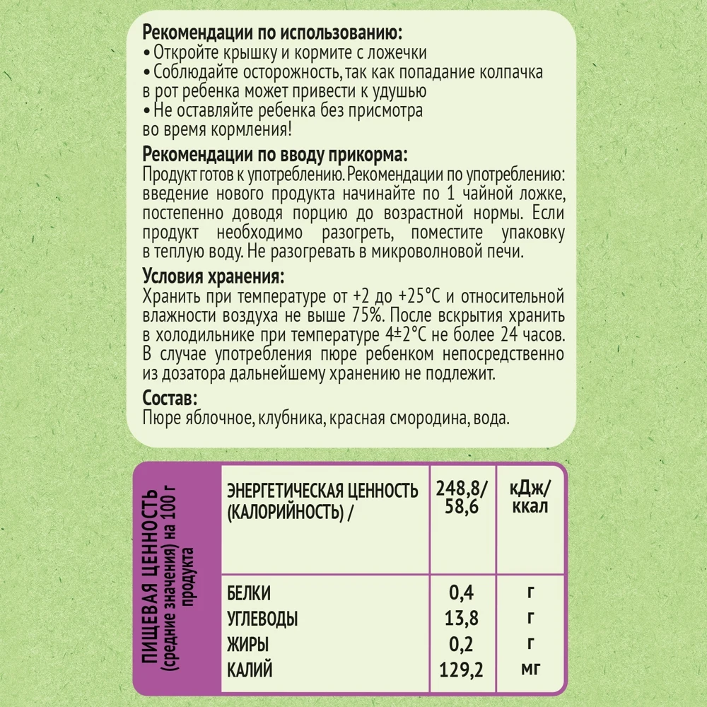 РЕКОМЕНДУЮ К ПОКУПКЕ.Пюре вкусное. Всегда беру с собой в перелеты и поездки.Крышечка крепкая. Куплено 11 июня по 16.99 в кол-ве 3 шт.( была скидка от изначальной цены 18.99 руб. 10% от 2 шт.) со скидкой 25% по акции магазина.Цена вышла за 1 шт. 12 р. 70 коп. Доставка 15 июня в пункт выдачи г.Ярославль через ТК DPD. Спасибо магазину за акции. Буду еще покупать обязательно.