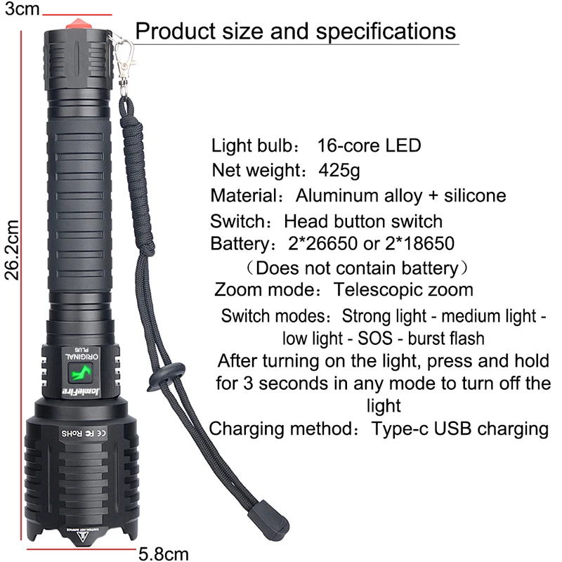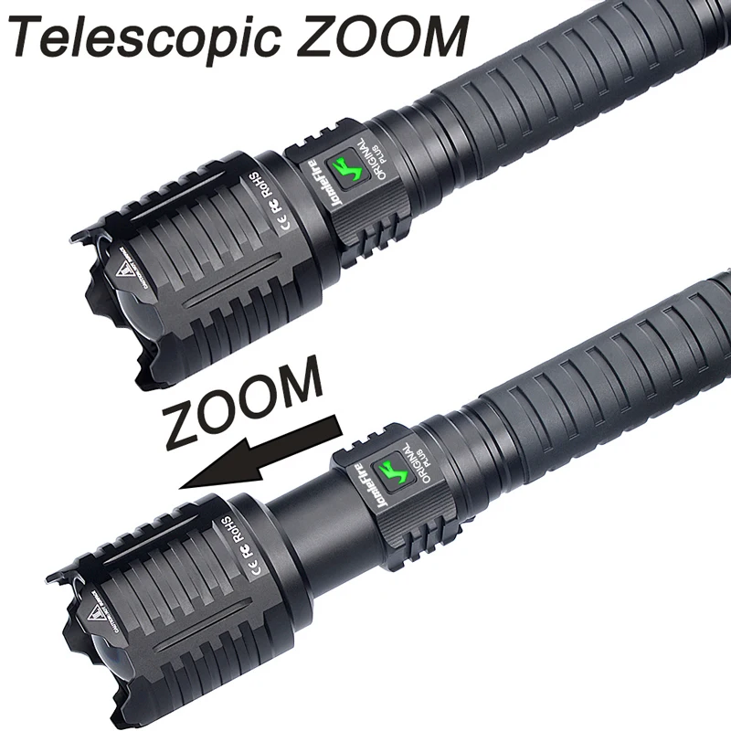 16-жильный светодиодный, водонепроницаемость IPX5, функция ввода и вывода, индикатор заряда батареи, телескопический зум, хвостовой молоток, можно использовать с батареей 266650/18650/21700