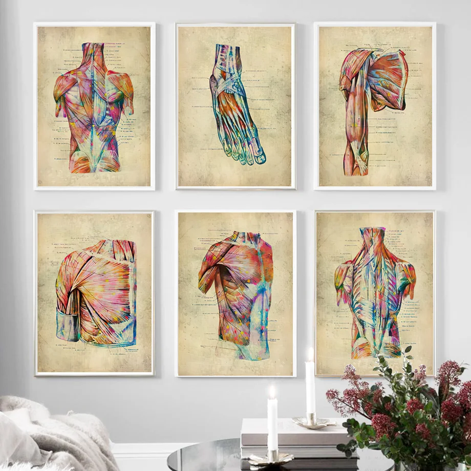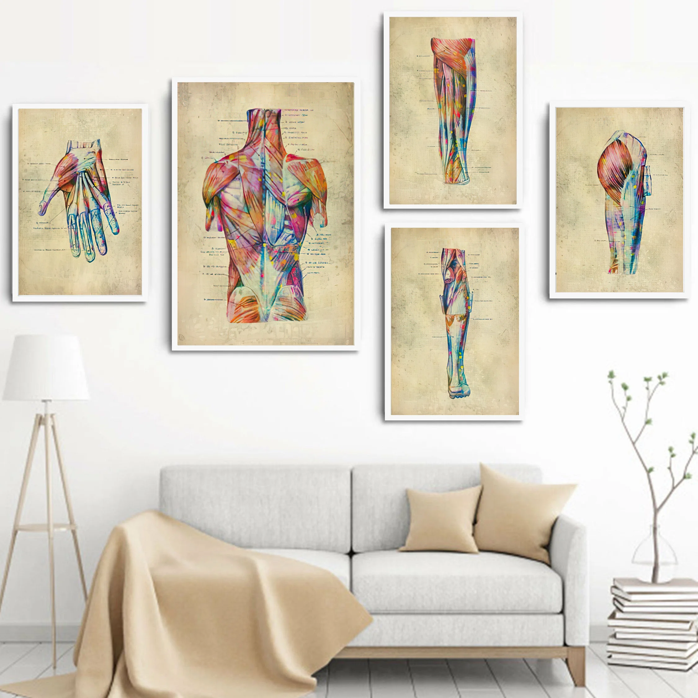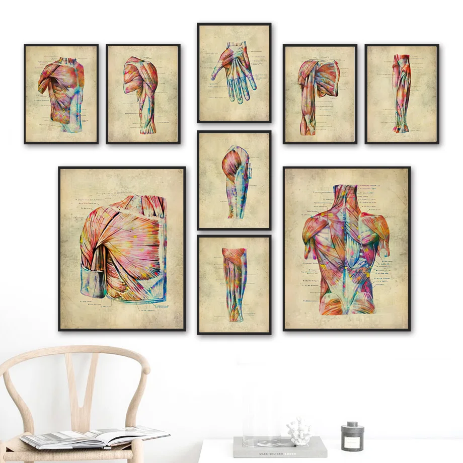 Картина на холсте с изображением мышечной системы человека в скандинавском стиле, винтажный анатомический плакат, медицинская настенная живопись, декор для гостиной