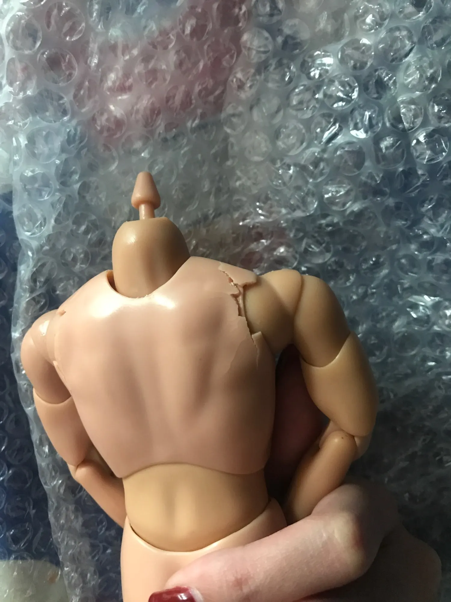 пришло с отломаной рукой ,заметно ,что тело собрано из разных частей прес грудь , бёдра и одна нога отличаются по цвету