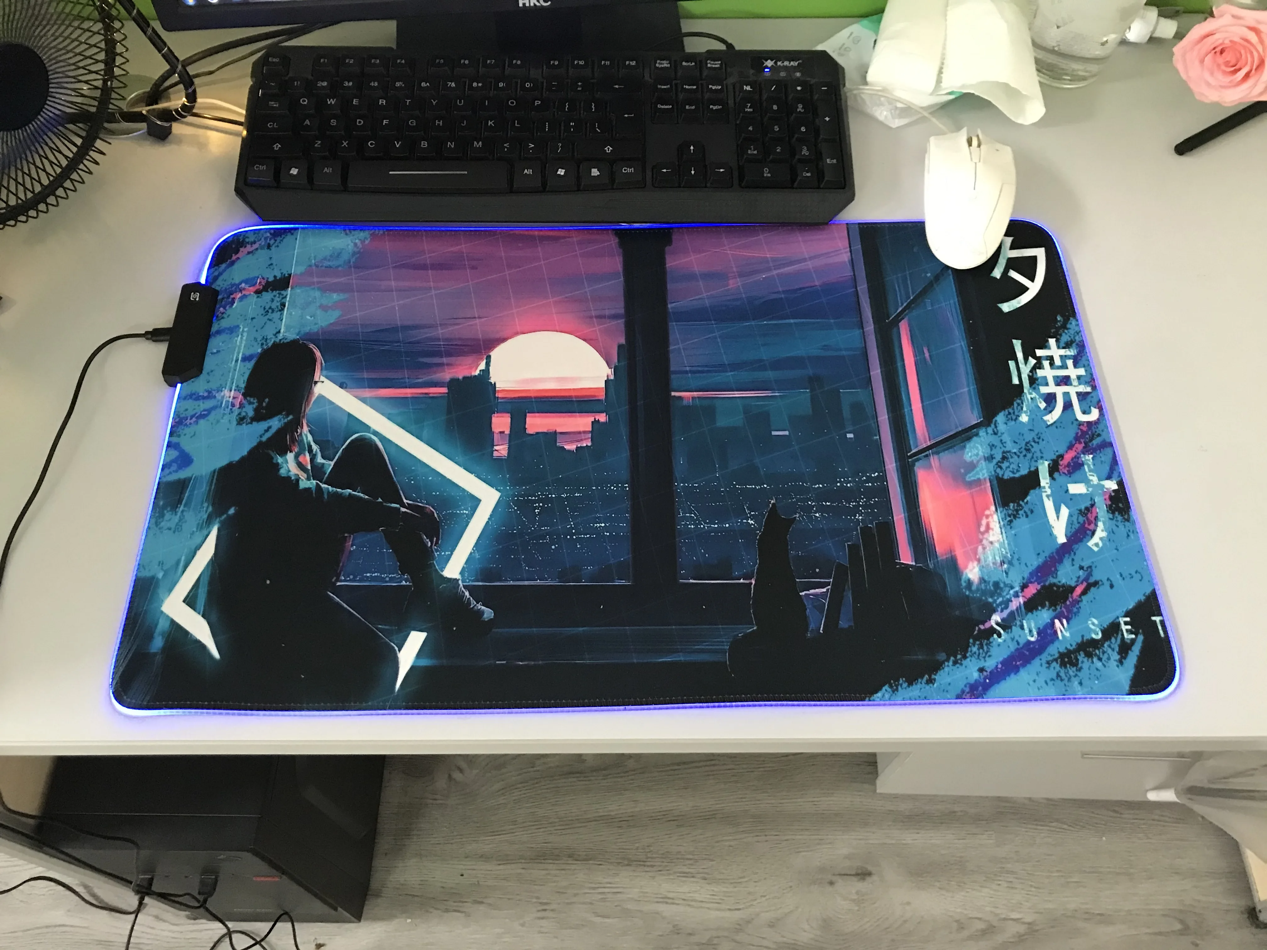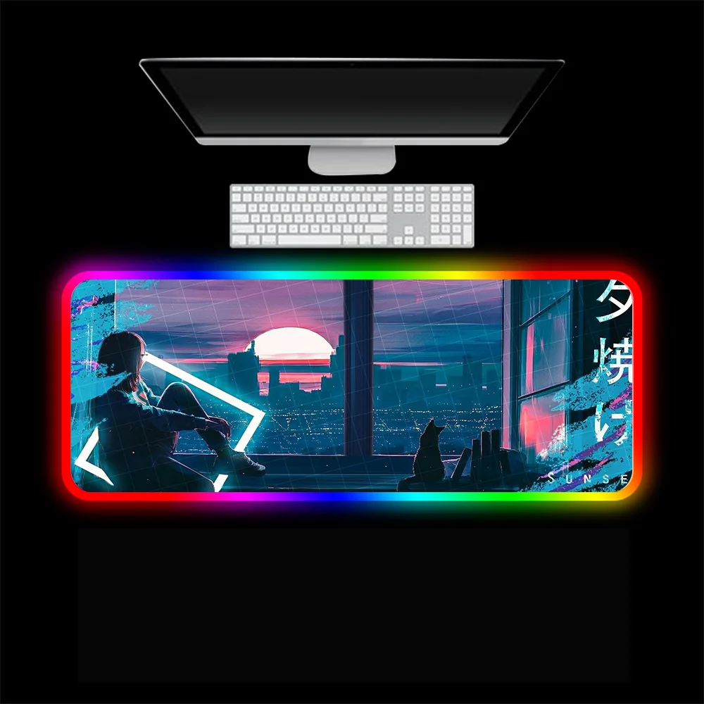 Игровой коврик со светодиодной подсветкой в стиле аниме Девушка за окном заката светодиодный, аксессуар для игр, Rgb-подсветка, коврик для ноутбука, офисный коврик с клавиатурой, размер XXL