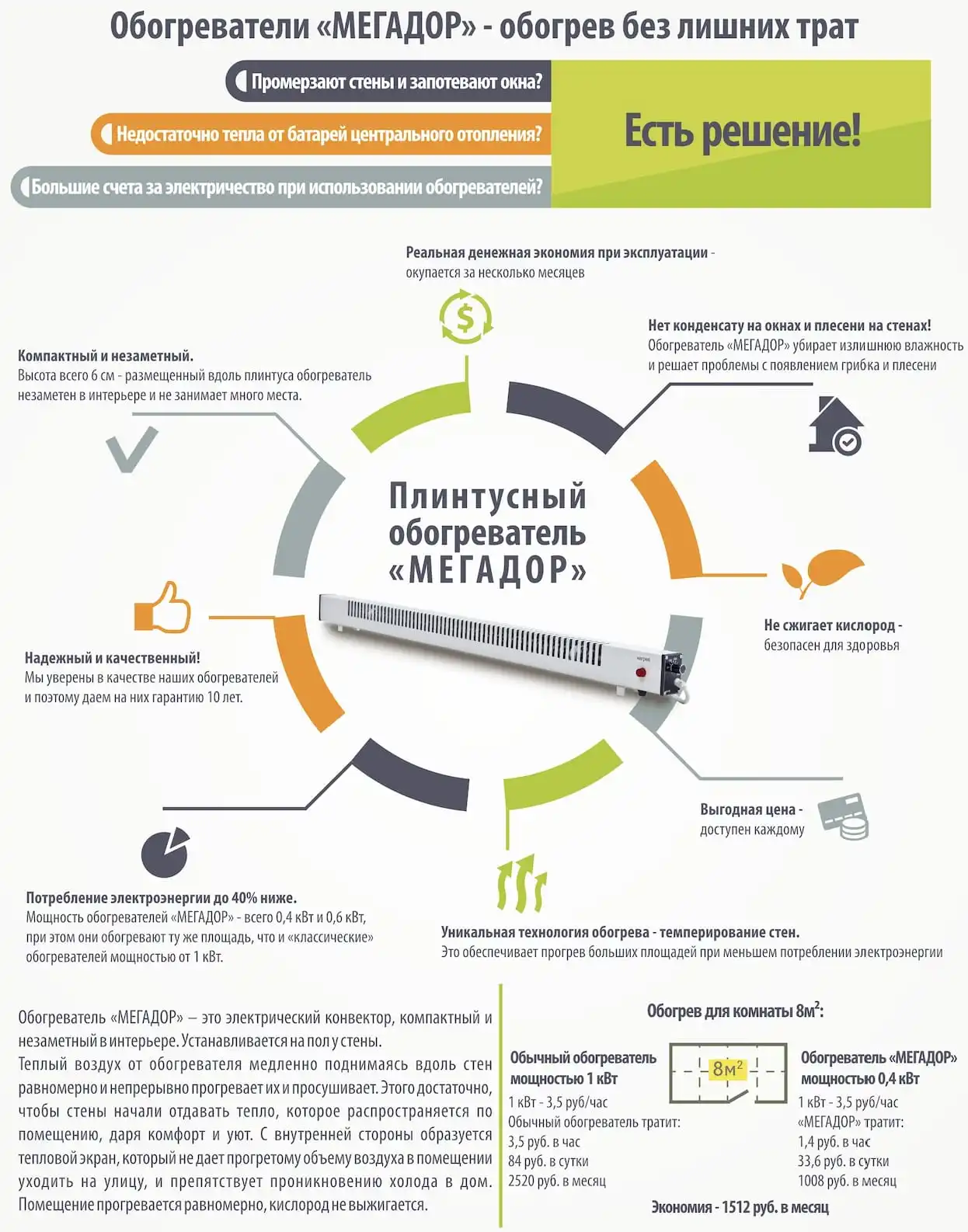 Обогреватели Мегадор идеально подойдут как для отопления жилого помещения, так и для лоджии, гаража или технического помещения.