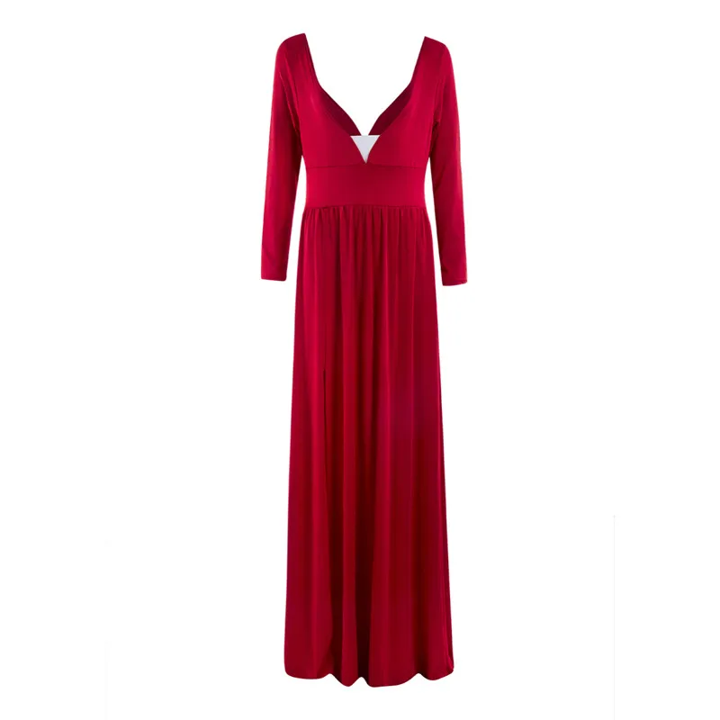 Женское весенне-осеннее платье макси с длинным рукавом, глубоким V-образным вырезом и пуговицами, однотонное вечерние платье с разрезом