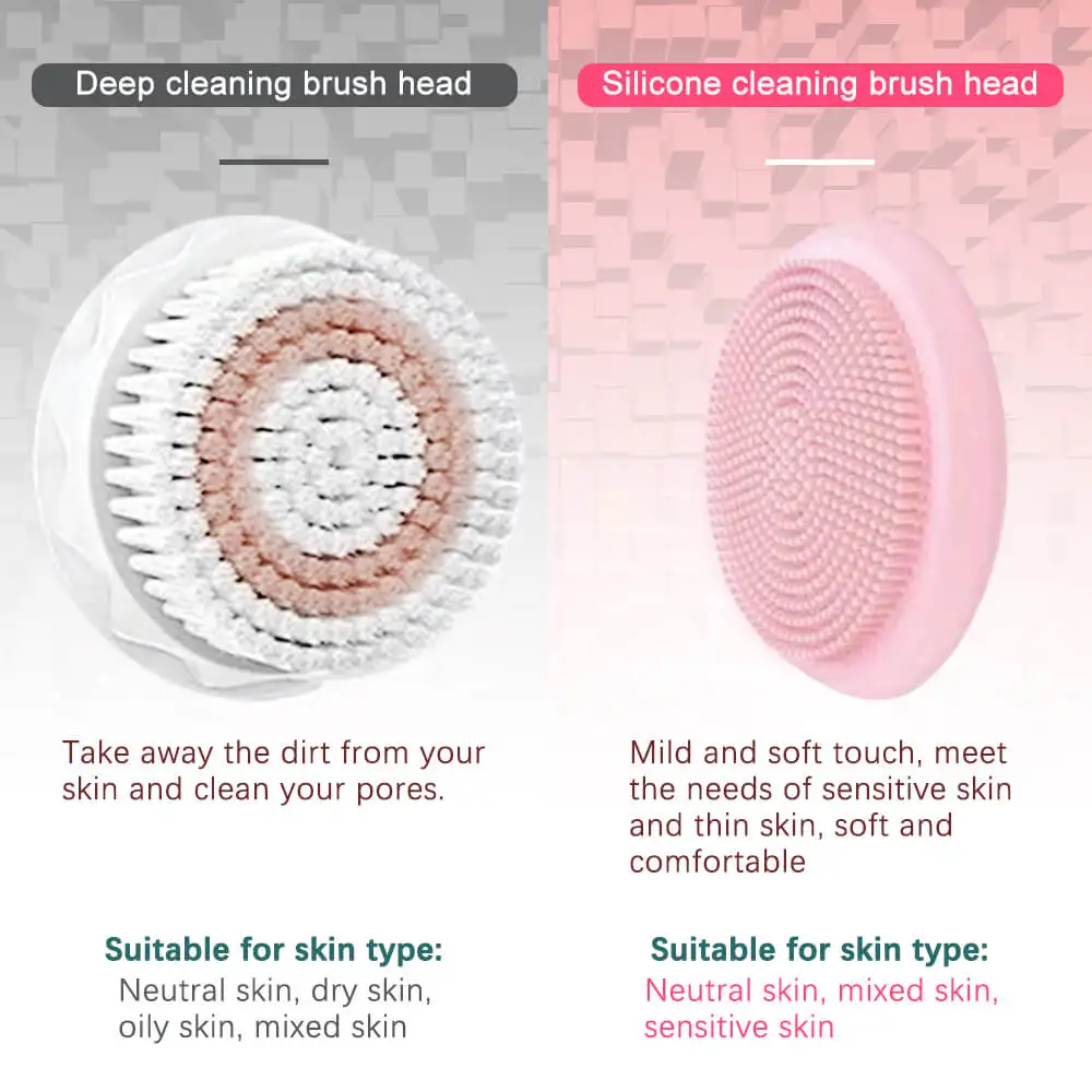 Головка щетки для чувствительной кожи: для чувствительной и более тонкой кожи, мягкая и удобная. -Насадка для глубокой очистки: Быстросохнущий материал, мягкий на ощупь и очищает поры. -Силиконовая насадка: органический силиконовый материал, подходит для всех типов кожи.