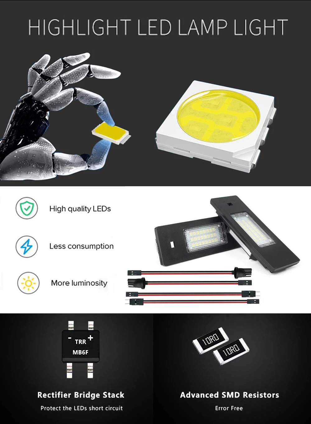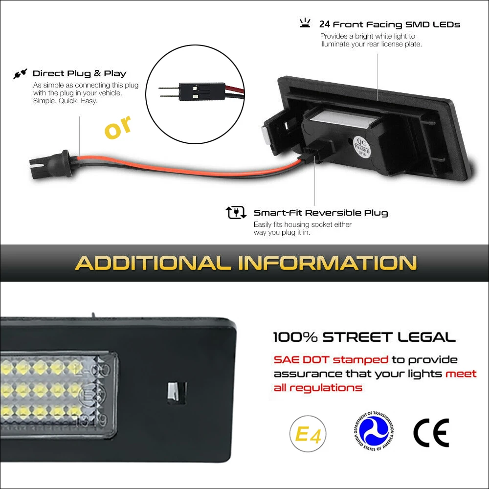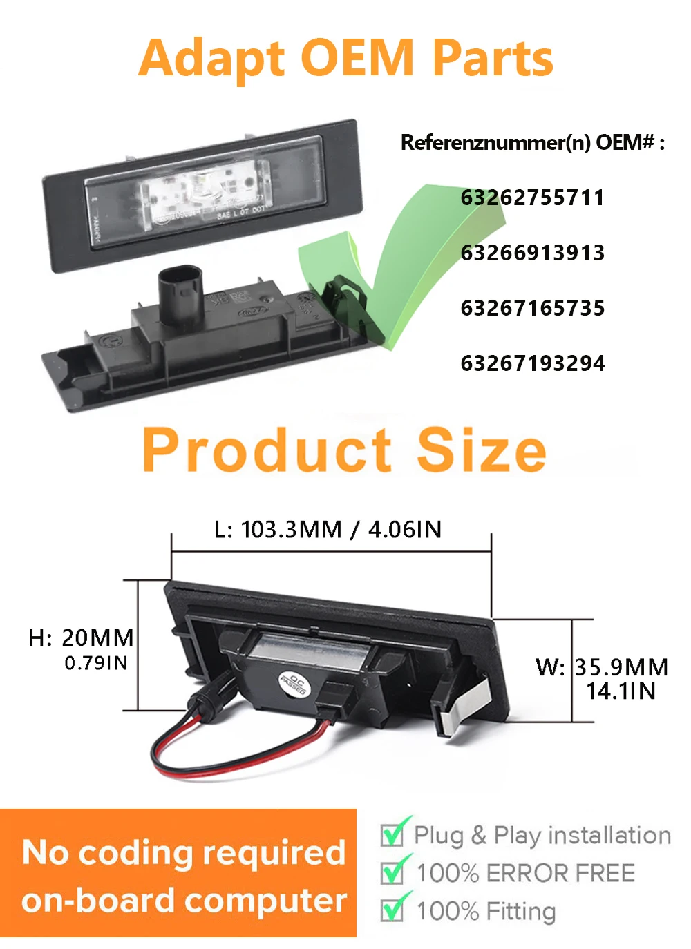 -Светильник с прозрачными цифрами и белыми светодиодами-Прямая замена, без ошибок, подключи и работай-Подходит только для автомобилей с заводской светодиодный подсветка номерного знака-Полностью E-marked и road legal, пройдет MOT-Высококачественная часть послепродажного обслуживания-Подходит как для RHD, так и для LHD трафика-Referenznummer(n) OEM #:63262755711,63-26-2-755-71163266913913,63-26-6-913-91363267165735,63-26-7-165-73563267193294,63-26-7-193-294