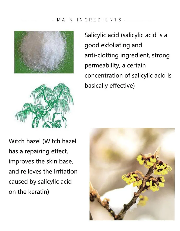 1. Салициловая кислота (салициловая кислота является хорошим отшелушивающим и антизакупоривающим ингредиентом, сильной проницаемостью, в основном эффективна определенная концентрация салициловой кислоты) 2. Ведьма орешник (ведьма орешник имеет Восстанавливающий эффект, улучшает базу кожи и снимает раздражение, вызванное салициловой кислотой на кератиновом фоне)