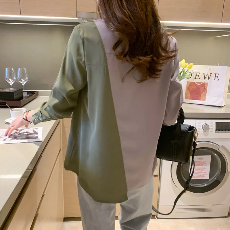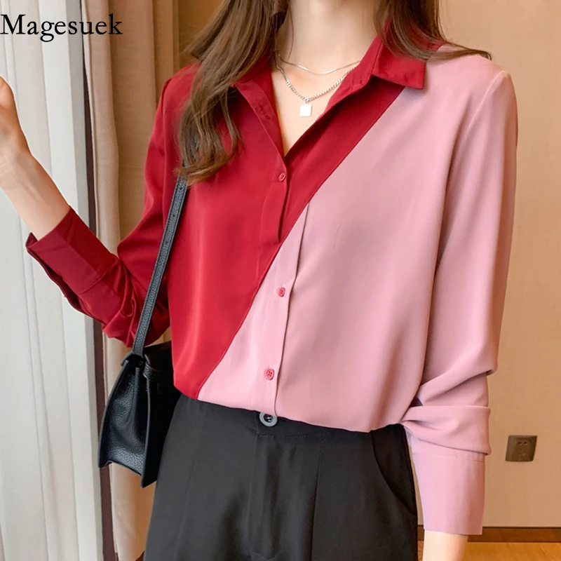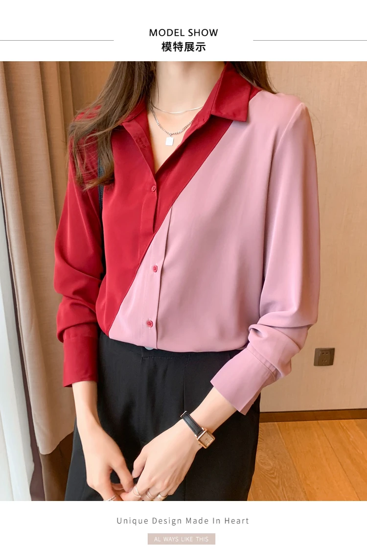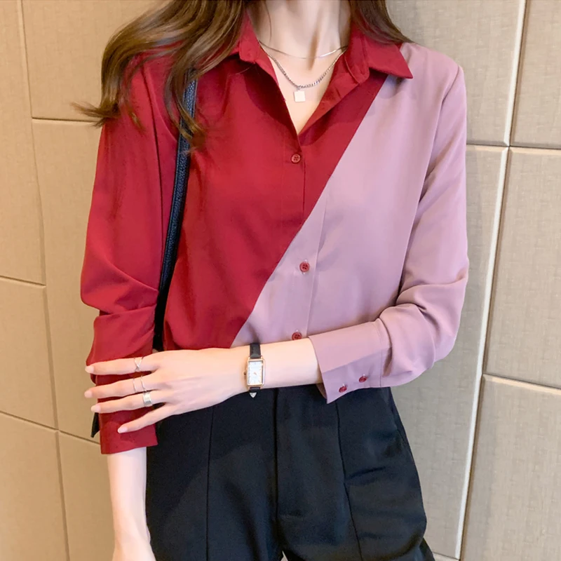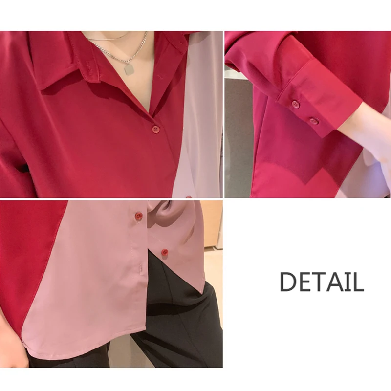 Размера плюс, новая весенняя шифоновая рубашка с длинными рукавами и отложным воротником Тонкий Топ шикарный контраст Цвет Лоскутная Блузка для женщин Blusas 13162
