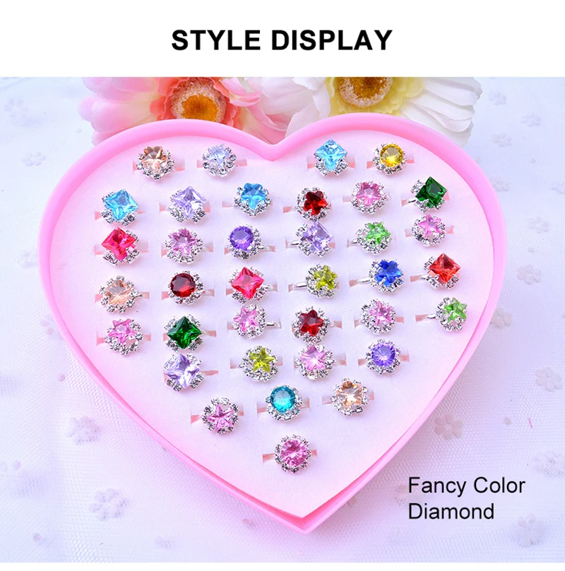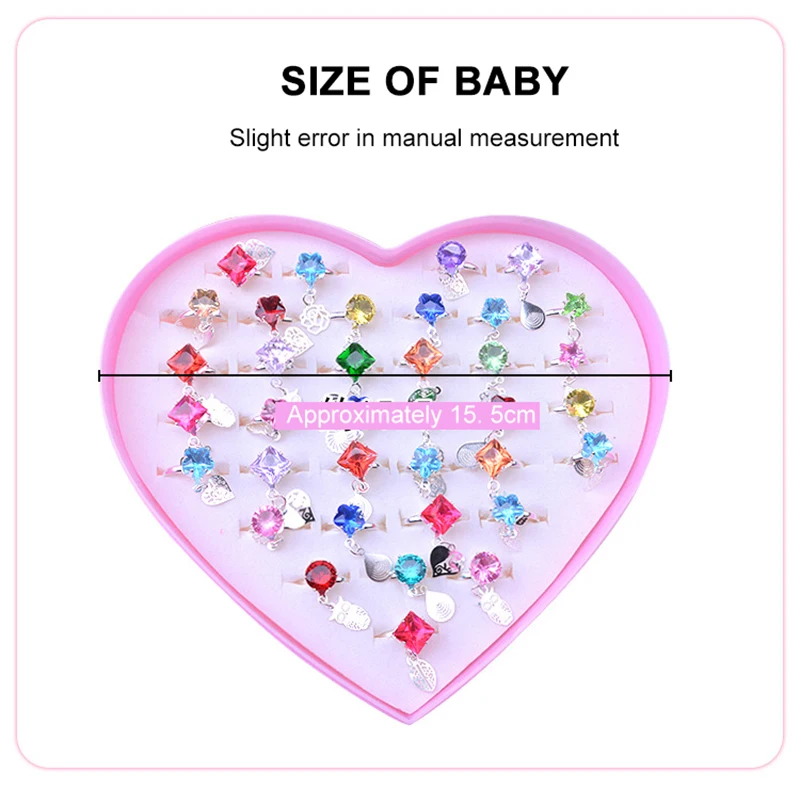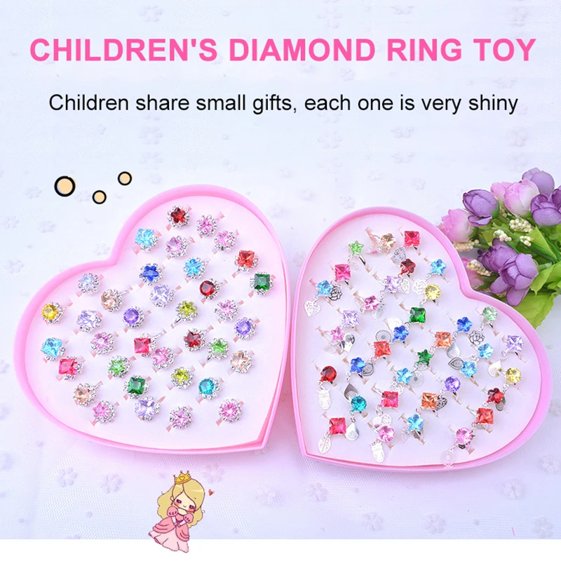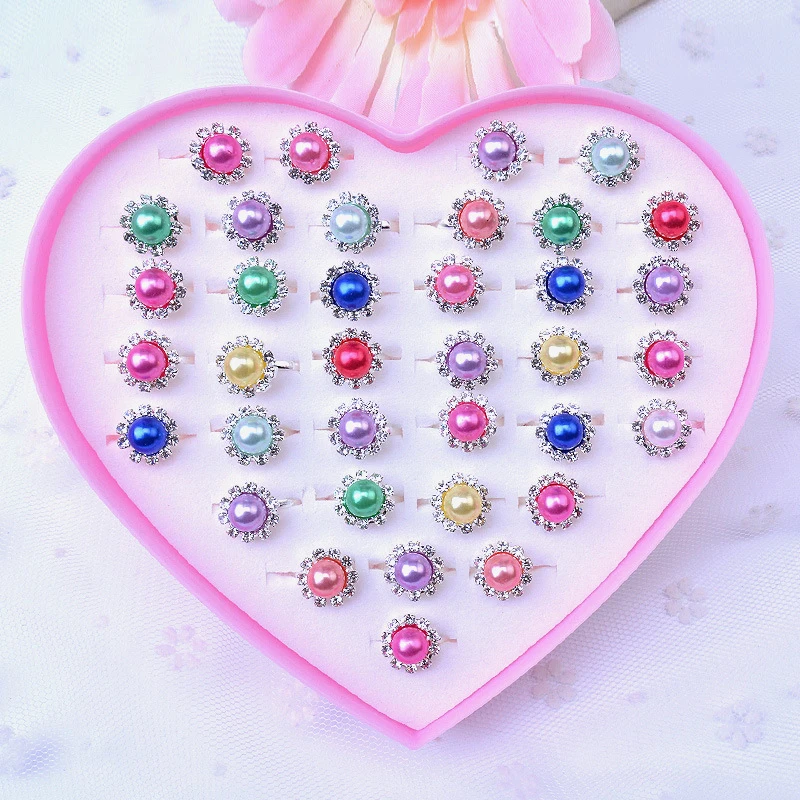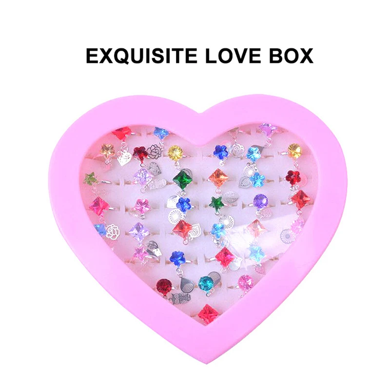 Набор колец для девочек, регулируемые пластиковые Колечки с кристаллами в форме сердца, 36 шт.компл.
