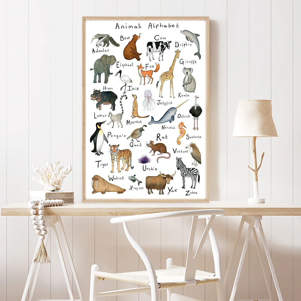Алфавит, животные, холст, плакаты, образовательные принты для детской комнаты, художественная живопись, скандинавские настенные картины для детской комнаты, домашний декор
