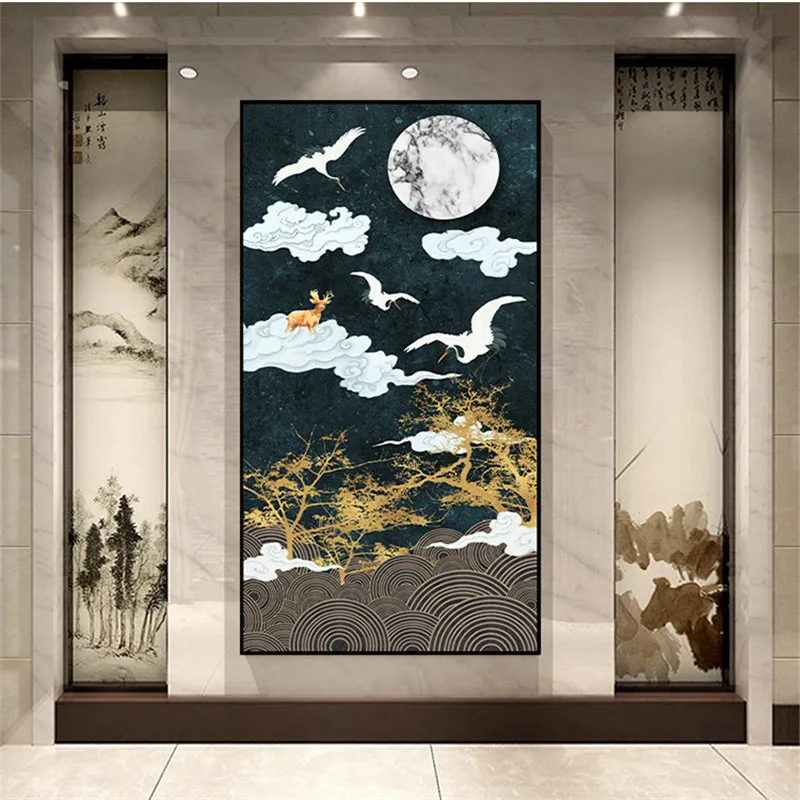 Абстрактный декоративный постер на стену в китайском старинном стиле с изображением животных, золотых цветов, журавлей, эстетический декор комнаты