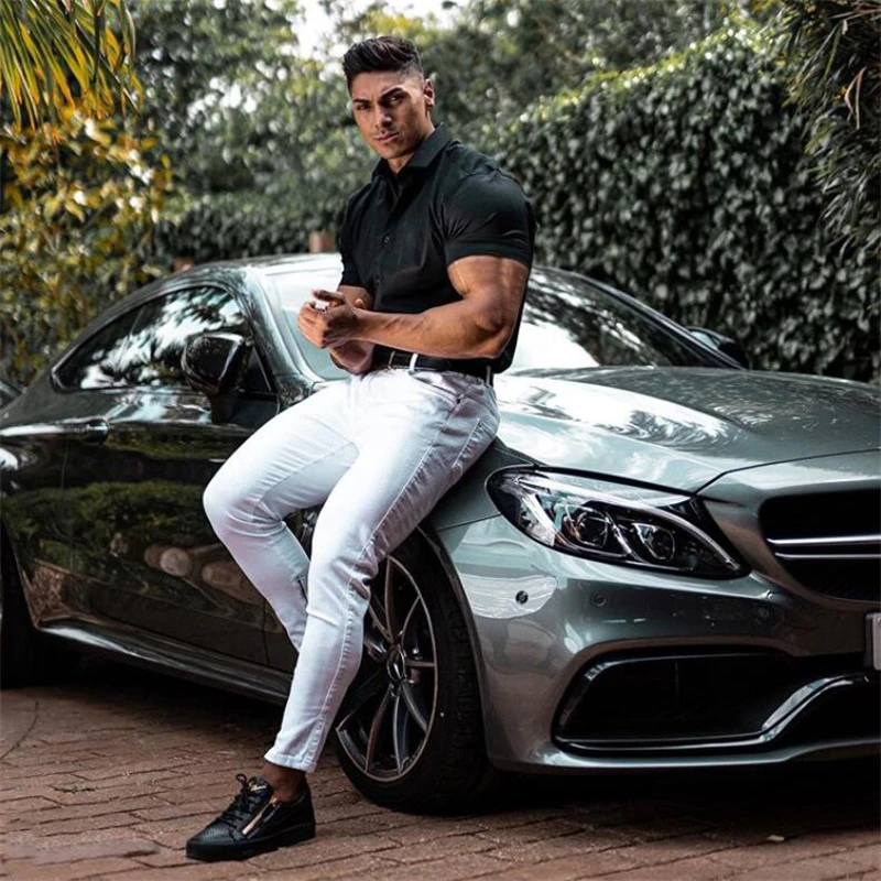 Рубашка мужская с короткими рукавами, модная повседневная супер приталенная, однотонная Деловая одежда для спортзала и фитнеса