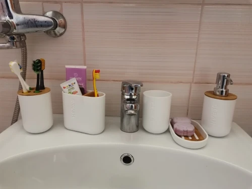Комплект из шести предметов включает в себя: 1 держатель для туалетной щетки (с деликатной коробкой) 1 мыльница (с деликатной коробкой) 1 дозатор для мыла (с деликатной коробкой) 1 держатель для зубной пасты (с деликатной коробкой) 1 держатель для зубных щеток (с деликатной коробкой) 1 чашка для рта (с деликатной коробкой)