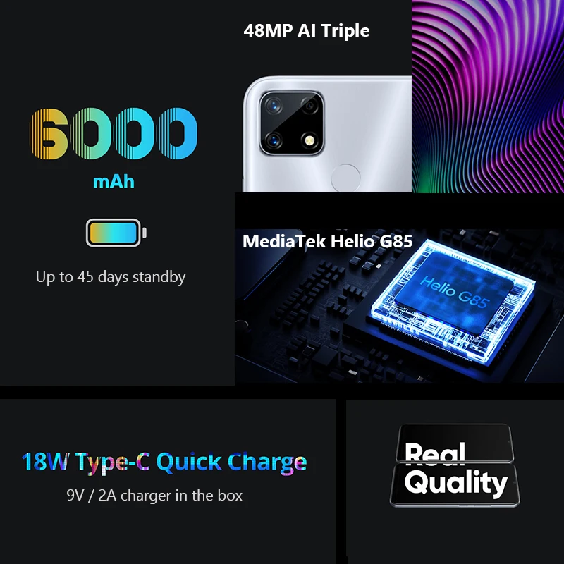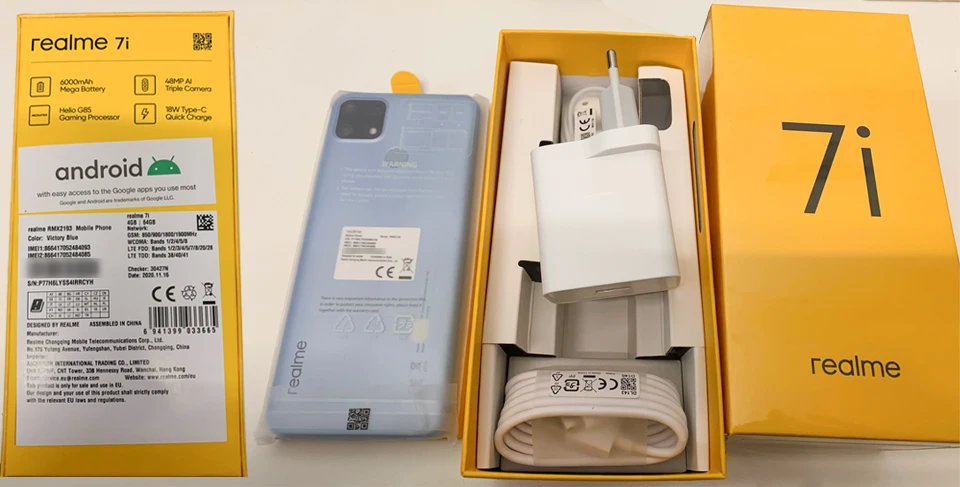 1 х realme 7i смартфонБыстрое зарядное устройство 18 Вт-1 шт.USB кабель (1 шт.);Руководство пользователя (1 шт.)1 булавка для sim-карты