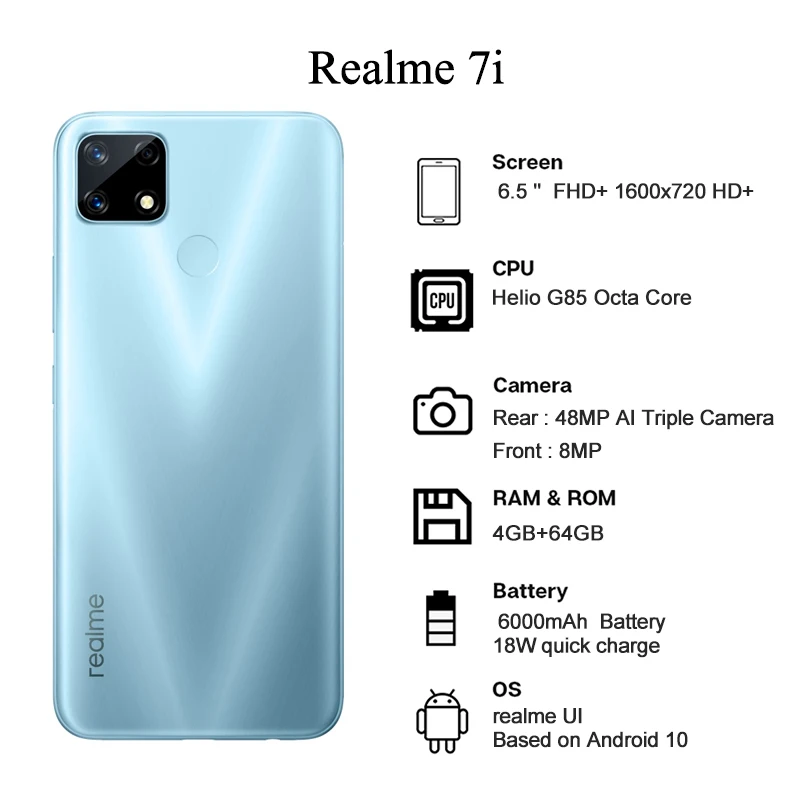 Дисплей: 6,5 дюйма HD +Разрешение: 1600*720 HD +ОС: realme UI на базе Android 10,0Память: 4 Гб | 64 ГБПроцессор: Octa CoreГрафический процессор: ARM Mali-G52 MC2Тыловая Камера: 48 Мп + 8 Мп + 2 МПФронтальная камера: 8MPБатарея: 6000 мАчСлот для карт: 3 слота для карт (2 слота для sim-карт + 1 слот для Micro SD)Другие особенности:Bluetooth 5,0, отпечаток пальца, GPS, электронная почта, обмен сообщениями, камера и т. Д.