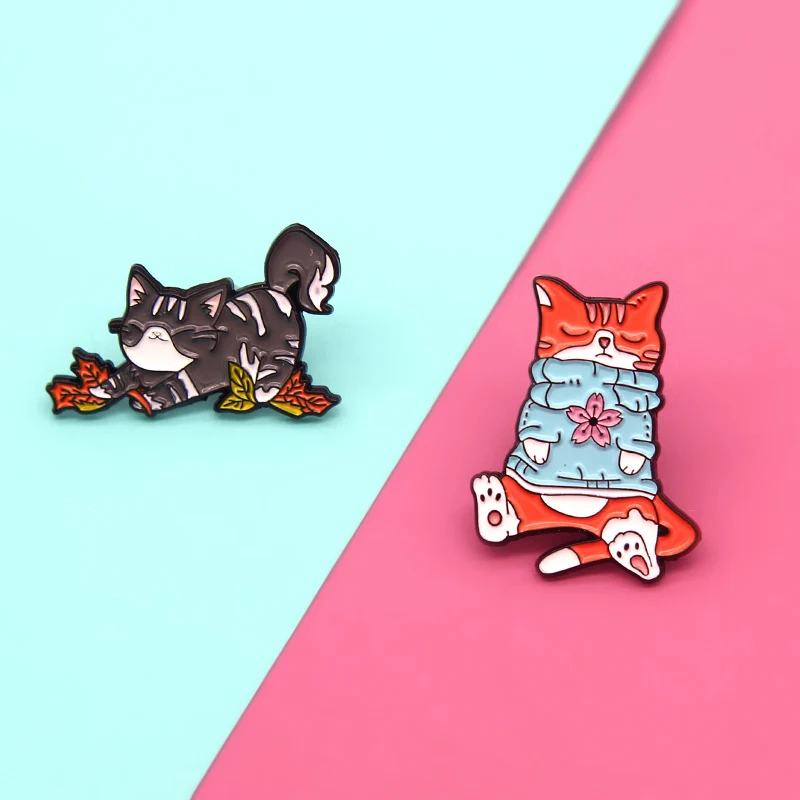 Симпатичная брошь в виде серого оранжевого кота, играющая с кленовыми листьями, розовыми цветами вишни, эмалированная булавка в виде котенка, мультяшная Детская бижутерия, подарок для детей