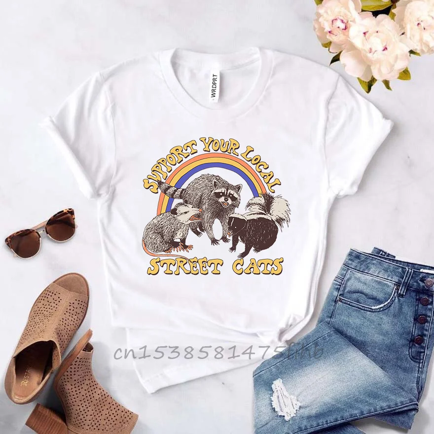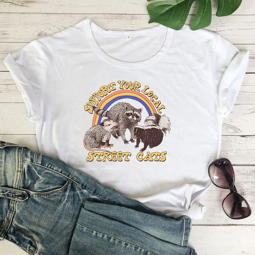 Футболка с надписью Support Your Local Street Cats, забавная Винтажная футболка из ткани премиум-класса с изображением енота, радужного котенка