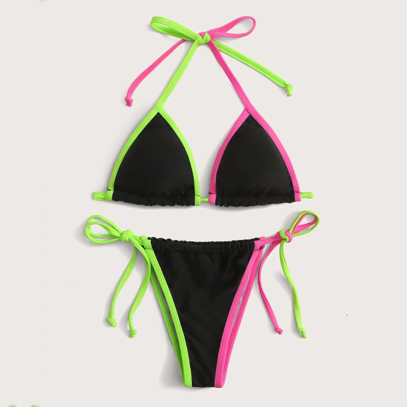 Классический треугольный купальник-бикини с лямкой на шее, игривая и сексуальная мода, шнуровка и цветной дизайн делают вас очаровательным во время пляжного отдыха, бассейна, морского побережья, медового месяца и т. Д.