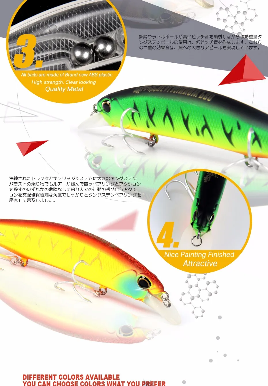 1. Крепкие тройные Крючки Bearking 2x: они оснащены крючками bearking, более мощными, прочными, пресная вода морская вода универсальная.2. Имитация кожи рыбы (лазер): дизайн имитации кожи рыбы делает ее более привлекательной для большой рыбы.3. Более сильные Бициклические Кольца: усиливают двойной круг, повышают сопротивление тяге.4.3D глаза рыбы: 3D Глаза Моделирования, большие и яркие, более Соблазнительные Светоотражающие лучше.5. Упаковка продукта: Каждая Приманка упакована в красивую розничную коробку из ПВХ.6. Подарок: Каждая наживка включает одну наклейку на рыболовные снасти bearking.