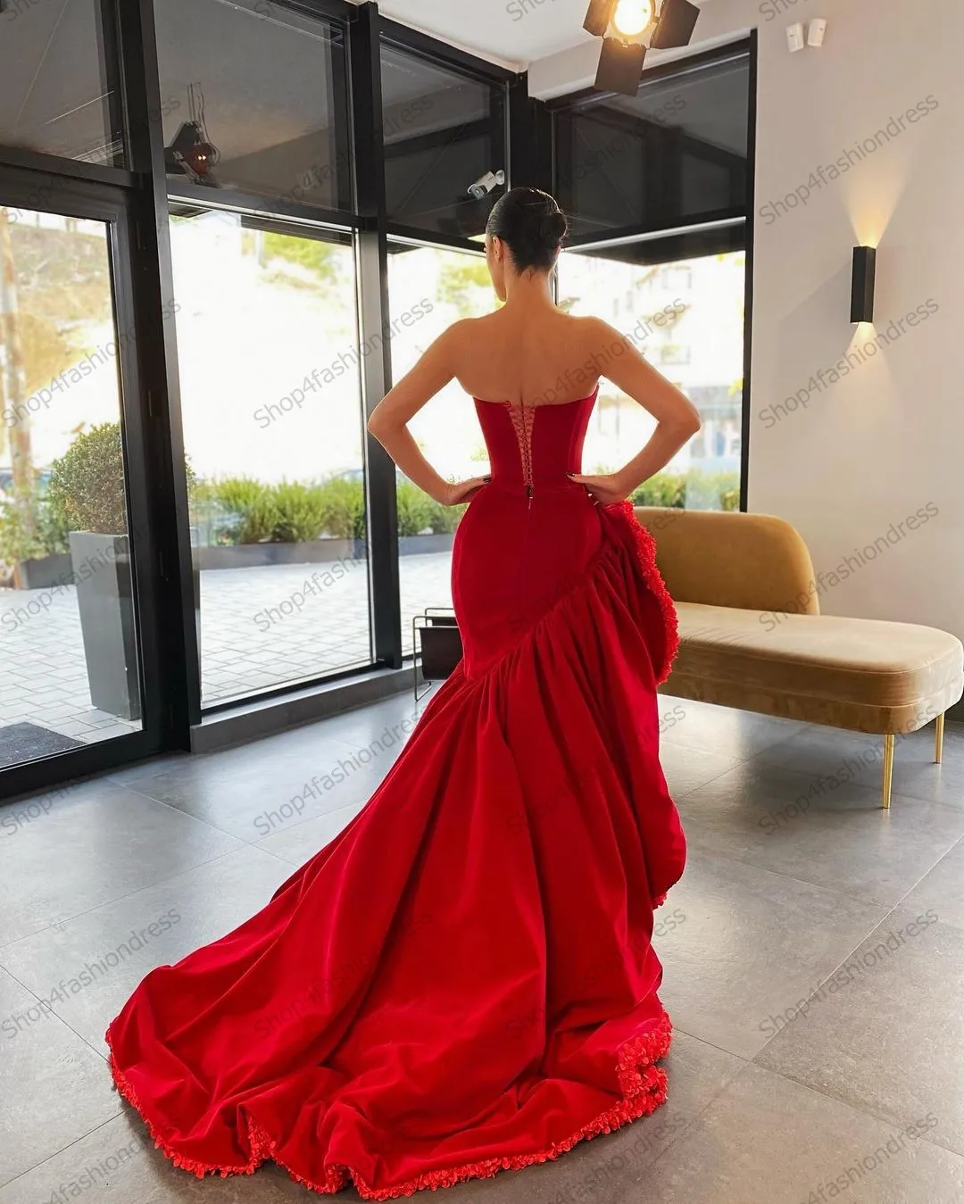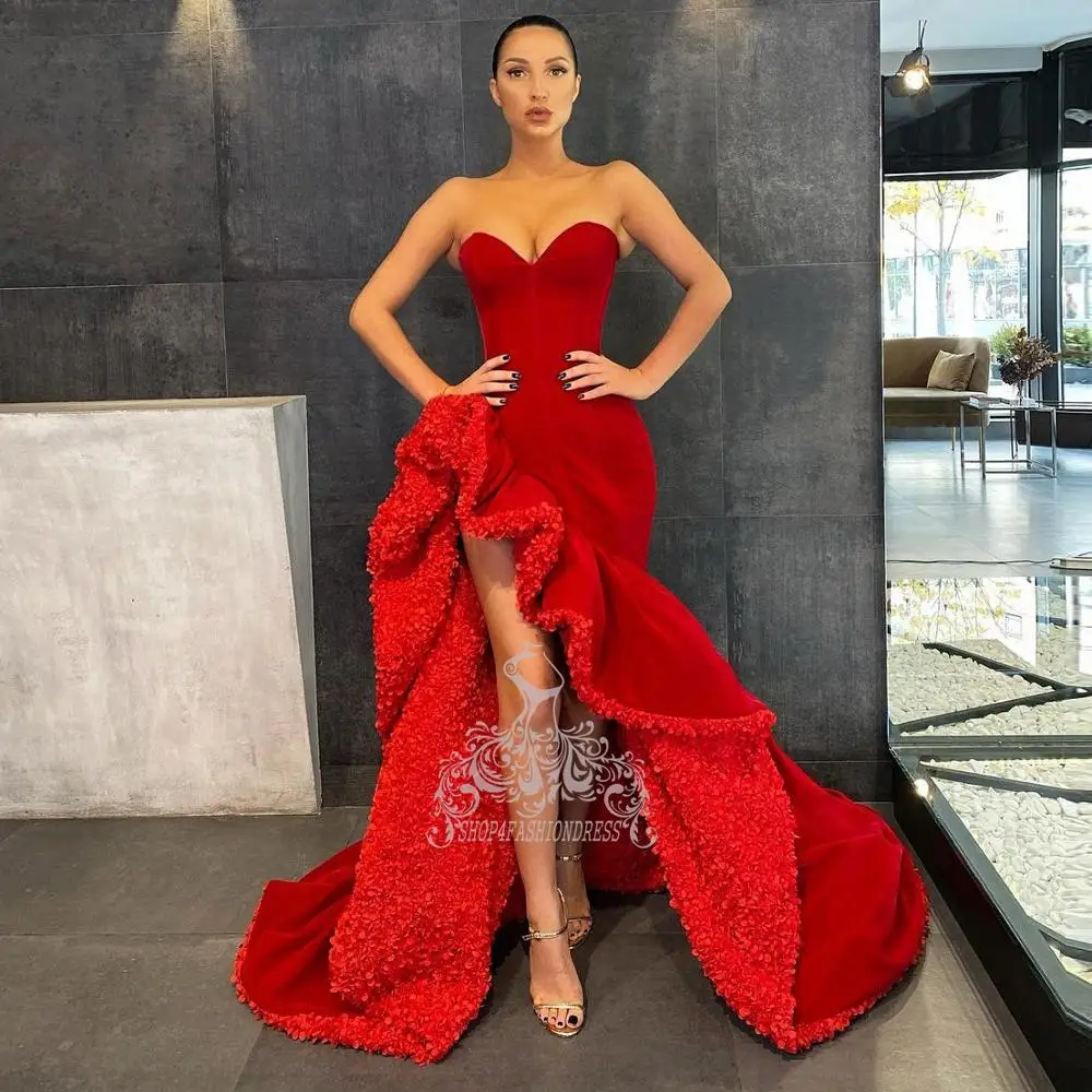 Современные красные вечерние платья-русалки с разрезом по бокам и оборками, сексуальные длинные платья без бретелек для выпускного вечера, вечерние платья знаменитостей