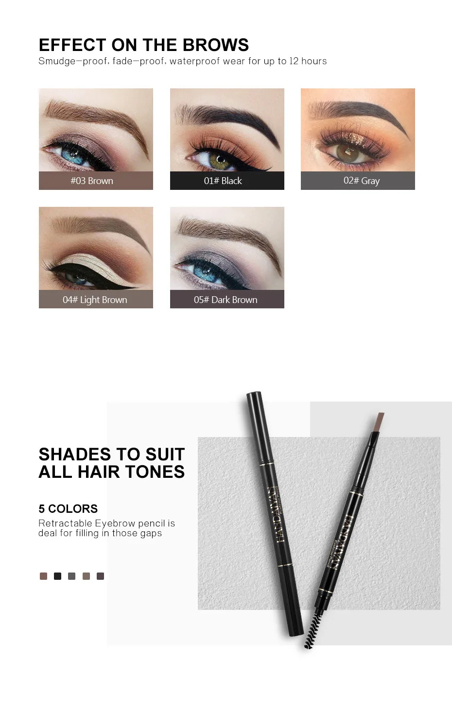 Описание:100% бренд новый высокое качествоВодонепроницаемый и долговечныйНарисуйте изысканные брови, гладкий порошокНе скользит, не качает, легко носитьСделать мягкий и натуральный макияжГладкая и легко носитьНет головокружения и уникального естественного составаС естественным и нежным цветом, который поможет вашей брови выглядеть более естественноДизайн с двойными головками, одна головка используется для расчесывания бровей, другая-для окраски бровейЛегко раскрашивать, делает ваш коричневый образ красивым и дарит вам Яркое настроение каждый деньДоступно 5 цветов, вы можете выбрать цвет, соответствующий вашему цвету волос или стилю макияжаИдеально подходит для профессионального салона, свадьбы, вечеринок и домашнего использованияНомер цвета: 01 # Черный, 02 # серый, 03 # коричневый, 04 # коричневый светильник, 05 # темно-коричневыйРазмер изделия: 14*9 смВес: 10,5 гПосылка включает в себя:1 * карандаш для бровей с двойной головкой