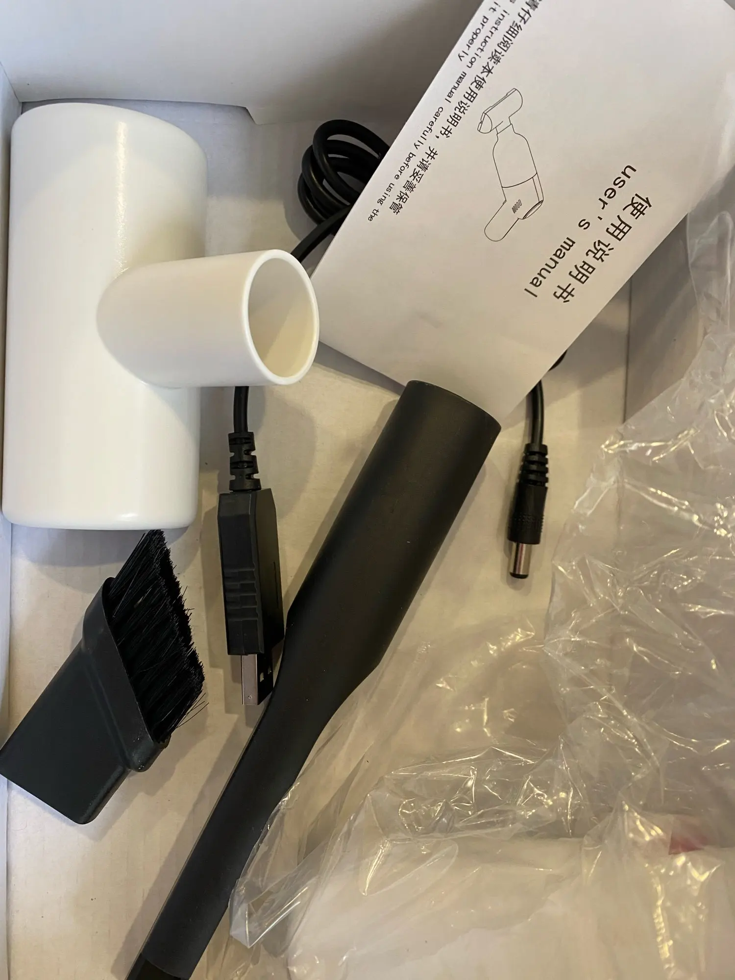 Всё пришло и работает. Приехал заряженный, не знаю правда на сколько, но сразу из коробки заработал. Три насадки и кабель для зарядки. Тяга довольно хорошая для такого малыша. Советую к покупке!!!